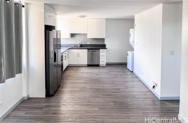 Enjoy golf course and mountain views, elegantly remodeled unit with open concept floor plan. Largest layout in the building hosting 3 bedrooms,1 full bathroom and 1 half bathroom. Freshly painted unit walls and base boards. New Samsung refrigerator and Samsung microwave hood. Washer and dryer in the unit. Multi level closet racking system for storage in all 3 bedrooms. Vinyl flooring throughout entire unit. Glossy white cabinets with quartz countertops matching set in kitchen and two bathrooms. Property manager on-site. Car wash area, additional community laundry, gym room, pool and BBQ area. Short drive to Salt Lake Shopping Center, Target, and to Aloha Stadium. Building is 100% fully insured for hurricane.