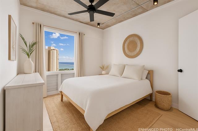 Wake up to sparkling ocean and canal views in this beautifully remodeled 2-bed, 2-bath retreat at 1717 Ala Wai. Renovated in 2024, this high-floor condo showcases a stylish, modern design with high ceilings, warm wood finishes, and custom storage that makes every space feel intentional. The sleek kitchen features quartz counters, contemporary cabinetry, and open shelving perfect for entertaining. Enjoy sunsets over Ala Moana and Waikiki from your private lanai, or unwind in two spacious, thoughtfully updated bedrooms. Washer and dryer in-unit, secure parking, and resort-style amenities complete this turnkey Honolulu gem.