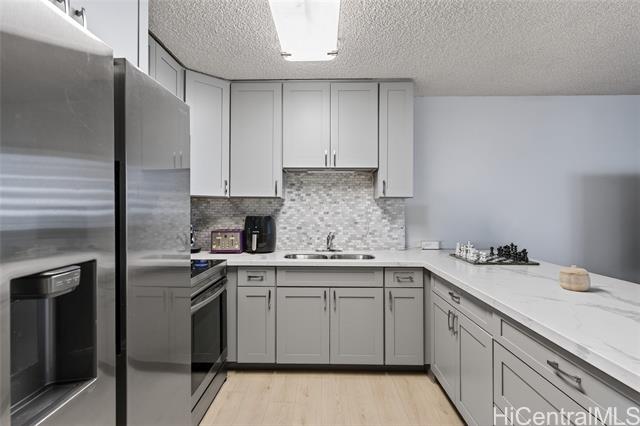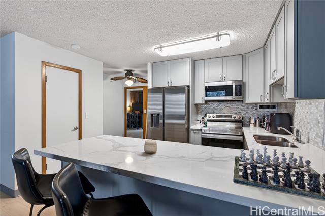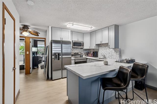 BACK ON THE MARKET! LOWEST 2 BEDROOM AT TRADEWINDS HOTEL INC. This unit was extensively updated in 2023 included an updated kitchen with stainless steel appliances and quarts countertops and new countertops, new flooring, new paint, newly painted doors, new hardware. The open-concept design makes the living area feel open and spacious. The lanai spans the width of the unit with dual access from either bedroom and has preinstalled storm shutters for protecting during storms. The bedrooms have floor to ceiling jalousie windows and lanai doors for optimum light and view of the greenery. The building offers community laundry on both buildings, bike storage, moped parking, and a salt water pool. The maintenance fees cover all of your basic utilities and property taxes. This unit currently is renting a parking stall that is located near the back gate that MAY be grandfathered in!