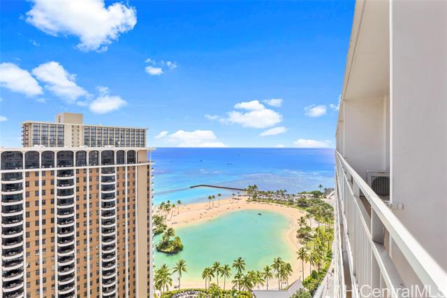 Beautiful ocean and Diamond Head views in this luxury high-floor oceanfront unit on the 25th floor of the Ilikai. The unit is special as it boasts 10' ceilings and was totally renovated in 2014 with designer furnishings throughout with everything turn-key: granite countertops, stainless steel appliances, kitchenware, split AC and more. The Ilikai is a resort-zoned condo-tel which offers legal daily rentals, w/ the unit currently in the Aqua Hotel & Resort hotel pool but also allows for personal use. With resort-style amenities including two pools, on-site dining, concierge service, and valet parking this is a paradise away from home as you are located just a few minutes directly to the beach and also world class shopping in Waikiki and Ala Moana Center. Such a PRIME location. Perfect for investors looking for an investment while being able to use the unit for their personal use as the Ilikai is an iconic building.