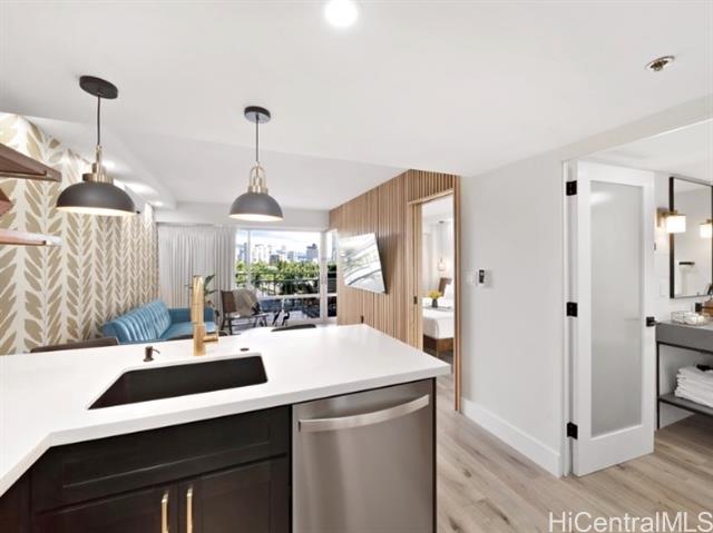 Fully remodeled and fully furnished one-bedroom, one-bath unit at the iconic Ilikai. This thoughtfully updated unit features a clean, modern aesthetic with quality finishes throughout, offering a turnkey opportunity for personal use or investment. The open living area flows seamlessly from the well-appointed kitchen, while the spacious bedroom provides comfort and privacy. Luxurious bathroom remodeled to exacting standards throughout, the quality design will impress you and your guests alike. Located at the gateway to Waikiki and Ala Moana, the Ilikai is a landmark oceanfront building known for its resort-style amenities, on-site dining, retail, and generous lobby spaces. Enjoy close proximity to world-class beaches, Ala Moana Shopping Center, marina, parks, and the vibrant dining and entertainment options of Waikiki, all just moments away. Ideal for those seeking a stylish island retreat or a well-situated income property in one of Honolulu’s most recognizable buildings.