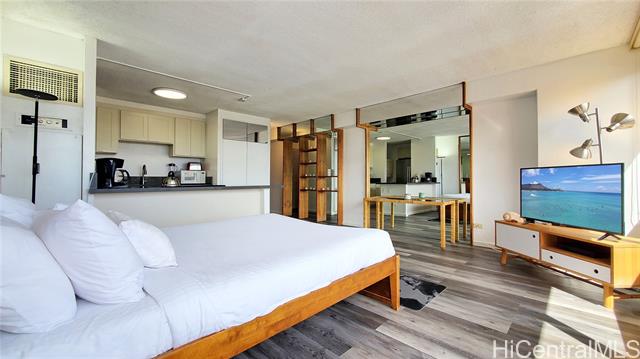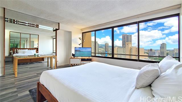 This modern studio offers sweeping mountain and city views that capture the beauty of Honolulu from sunrise to sunset. Large windows fill the space with natural light, creating an inviting and airy atmosphere perfect for Island living. Conveniently located near famous beaches, Ala Moana Shopping Center, variety dining and entertainment. This well-situated residence provides the ideal blend of comfort, convenience and vibrant Waikiki lifestyle. Perfect as a full-time residence, vacation getaway, or investment opportunity. This unit is 96.893% fee simple. The AOAO has the rights and the obligation to acquire remaining leasehold interest (3.10%) before the lease ends on December 31, 2039. Lease rent is approximately $12 a month or $36 a quarter. Starting January 1st, 2030, lease rent is projected to increase to $9.66 to $39.51 per month. Photos have been digitally enhanced. Owner is listor/licensed and has partial ownership interest in the property.