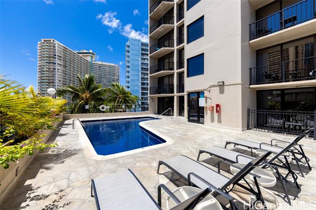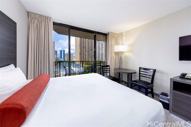 Palms at Waikiki is situated at the entrance of Waikiki in a superb "island lifestyle" location, nearby beaches, parks, shops, and restaurants. Inside this studio residence you'll find an updated island-modern design that includes a kitchenette, stone-tiled bathroom with a large vanity, built-in closet and cabinetry, and an outdoor lanai that looks toward the entrance of Waikiki with partial Pacific Ocean views. Well-kept on-site amenities include an exercise gym, swimming pool, barbecue and outdoor entertainment spaces. This exceptional location is positioned just blocks from Hilton Hawaiian Village's stunning lagoon, world-famous Waikiki Beach, boutique neighborhood shops, cafes, and more. Sale includes a rarely available deeded parking stall. Property is in the hotel rental pool. Inquire for investment performance.