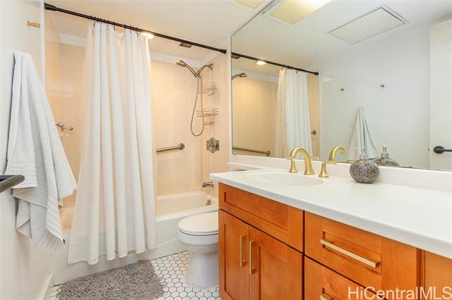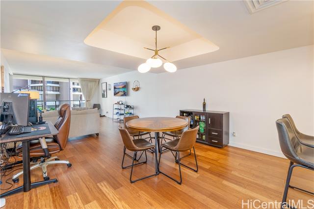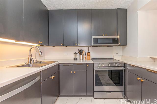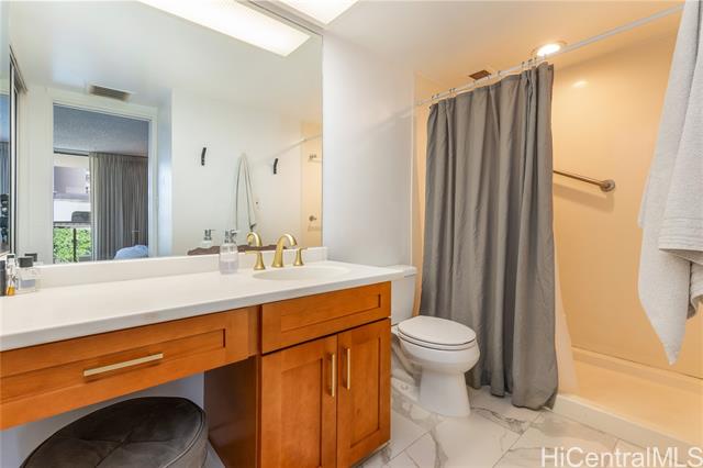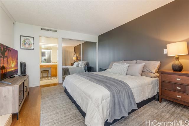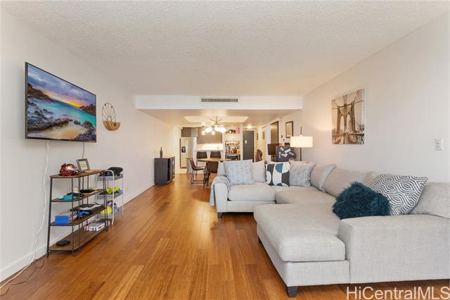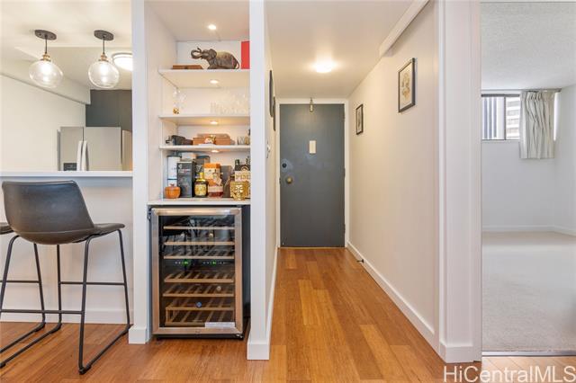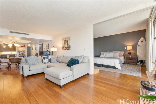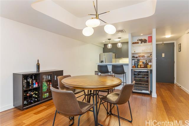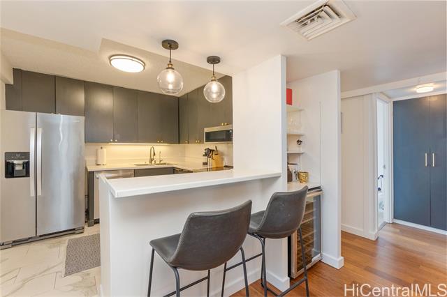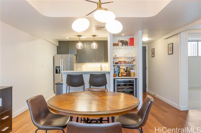 Beautifully remodeled Wailana residence conveniently located at the gateway to Waikiki! This move-in ready, fee-simple unit features 2 bedrooms, 2 bathrooms, and 1 parking stall. Enjoy fresh air on the spacious lanai with Diamond Head and city views, perfect for relaxing or entertaining. The fully remodeled kitchen showcases upgraded stainless steel appliances, including a wine fridge, solid stone countertops, and opens seamlessly to the bright living area. Central AC unit was replaced in 2022. Elegant hardwood and marble tile flooring throughout add a sophisticated touch. Wailana at Waikiki is a pet-friendly building offering amenities such as a pool, recreation area, secured parking, and extra storage. Enjoy living just moments from world-class shopping, dining, and entertainment, Fort DeRussy Park, beautiful white-sand beaches, and the renowned Ala Moana Shopping Center.