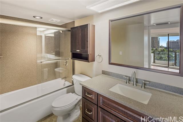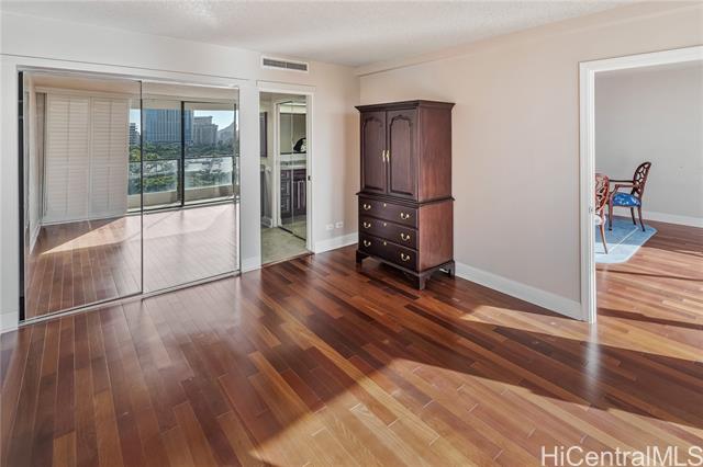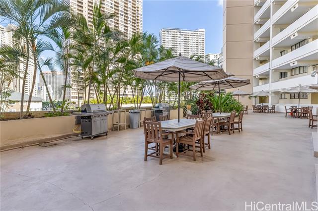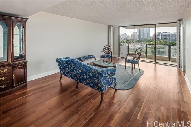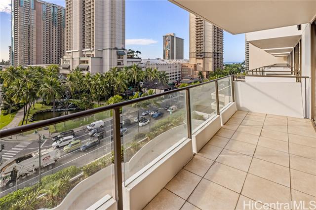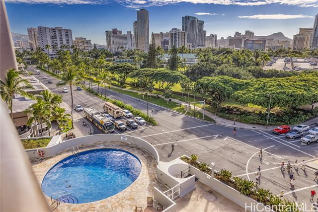 Perfect blend of comfort and convenience in this spacious 8th-floor unit at Wailana at Waikiki. Breathtaking views of Derussy Park, Diamond Head, and Waikiki, along with a glimpse of the ocean from the expansive lanai that connects the living room and primary bedroom. Located just minutes from the iconic Waikiki Beach, Ala Moana Shopping Center, and Hawaii Convention Center, this unit is surrounded by a vibrant array of shops and restaurants. Hardwood flooring throughout, paired with updated kitchen cabinets and luxurious granite countertops. Plantation shutters through out and floor-to-ceiling glass doors. For added privacy, shoji doors have been replaced with a traditional entry door between the living room and bedroom. Includes one secured and assigned parking space, plus additional storage conveniently situated near the front door. Amenities include surfboard and bicycle storage, a refreshing pool, and a BBQ area for outdoor enjoyment. Enjoy the convenience of the Island Market and Deli on the ground floor and a variety of dining options across the street. This is a leasehold property with the lease expiring in 2029, with an option to purchase an extension to 2069.