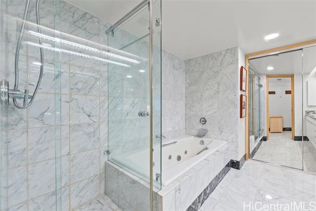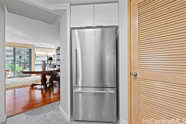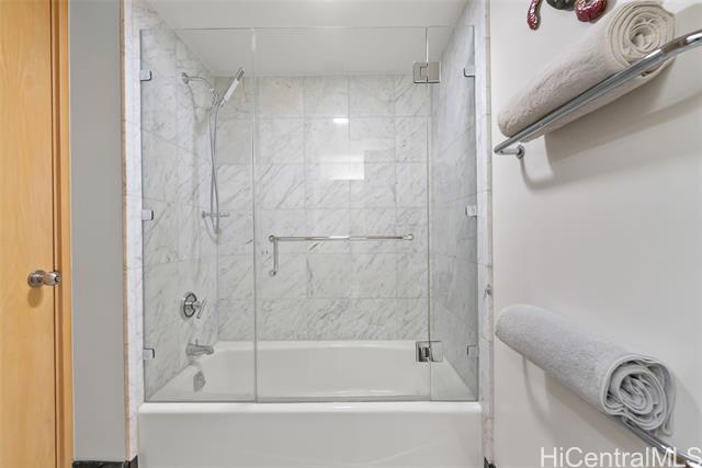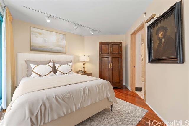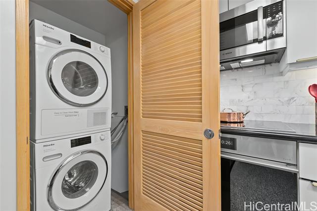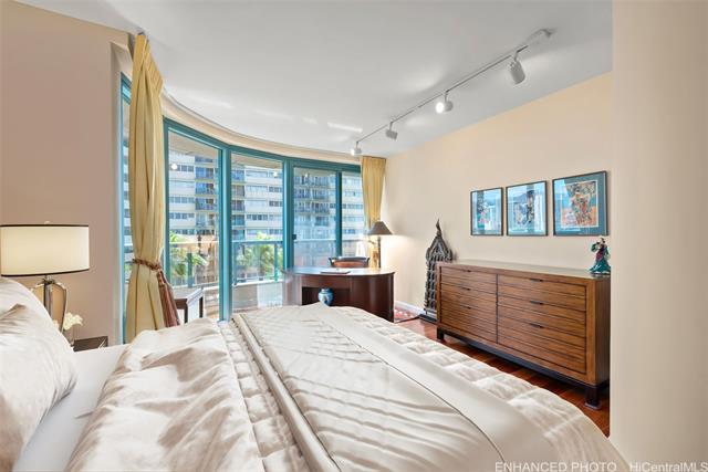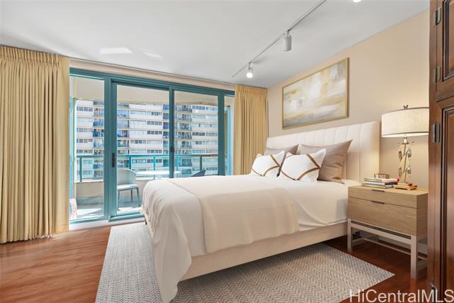 Waikiki Landmark 907 combines thoughtful luxury upgrades w/ a warm sophisticated aesthetic. Rich hardwood floors guide you through a spacious open layout that feels both elegant & comfortable, creating an effortless flow from the foyer into the main living areas. Every detail has been refined for longevity style and ease of living. The kitchen features premium appliances including a GE Cafe wall oven, Miele cooktop, Paykel refrigerator, Bosch microwave, and stacked Miele washer & ventless dryer all complemented by a striking Calacatta marble backsplash. Energy efficient LED lighting & Energy Star appliances keep electricity costs low even with AC running. Bathrooms showcase restored marble surfaces, polished floors, refreshed countertops, and a newly regrouted shower. New zoned AC systems in the living room and guest suite along with a rebuilt primary bedroom unit to ensure consistent cooling throughout. Designer touches include Hunter Douglas Duette shades, brass alabaster foyer sconces & refined LED track lighting. Residents enjoy the full suite of amenities, including a swimming pool, updated fitness center, 24 hour security, & guest parking. Schedule a showing today!