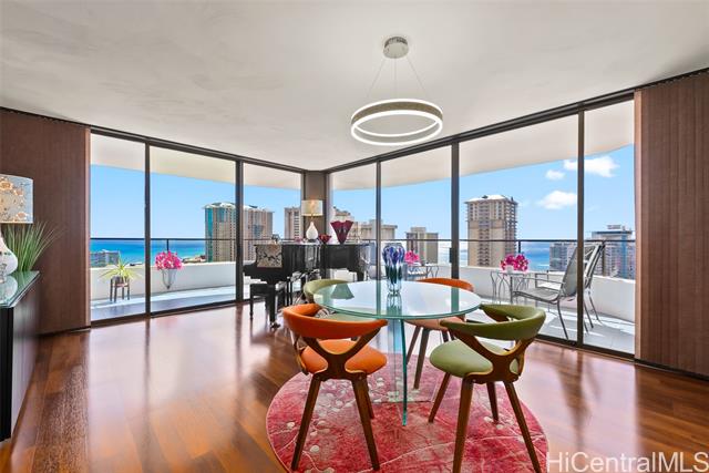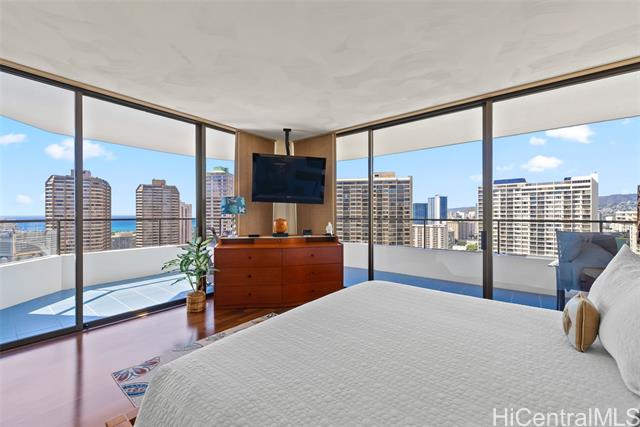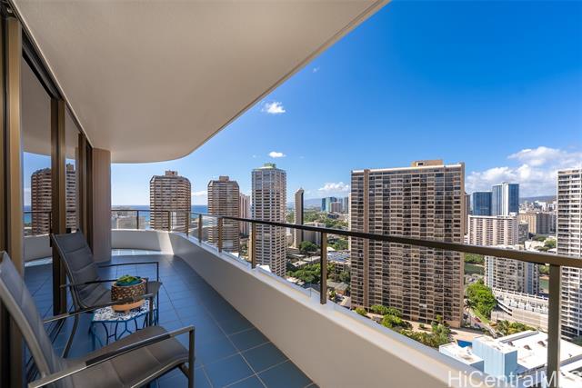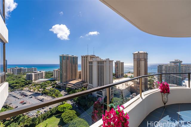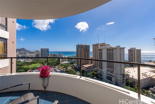 Residence #32A commands one of the most dramatic vantage points in all of Honolulu. Perched on the 32nd floor, where the exclusive penthouse collection begins, & spanning the full width of the building, this prized corner unit showcases nearly 270° of unobstructed, panoramic views—from Diamond Head to the ocean, mountains, & city lights. Enjoy a one-of-a-kind, multi–million dollar view experience from every room and 2 wrap around lanais that no other Hawaii home can offer. With its rare east-to-west orientation, #32A captures sunrise to sunset views & provides a front-row seat to the weekly Friday night fireworks show. Designed by acclaimed interior designer Glenda Anderson & thoughtfully updated over the years, every detail of this residence has been meticulously planned & beautifully executed. Exceptionally located within moments to world famous Waikiki beach, & the dining, entertainment, & recreational hub of the Pacific. All furnishings & a car are available at no cost for a truly turn-key, move-in ready purchase. Amenities include a pool, spa/sauna, BBQ, & pickleball court. Pet-friendly (2 pets ok). Bldg. allows min. 30 day rental. HOA includes all utilities. Sold AS-IS.