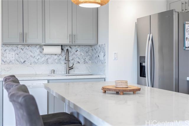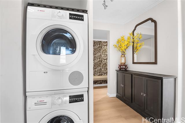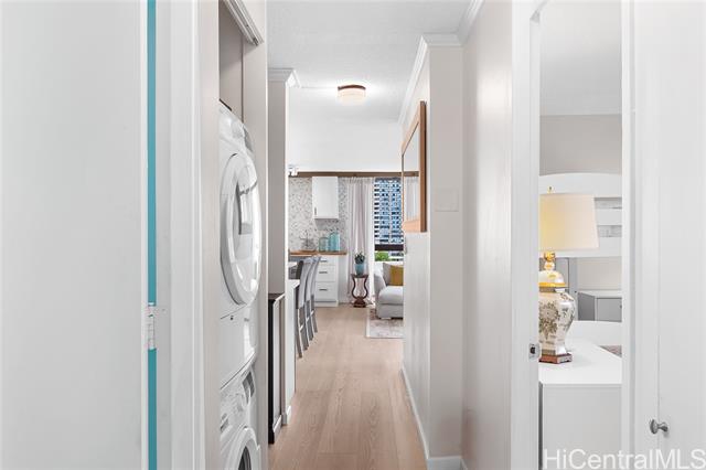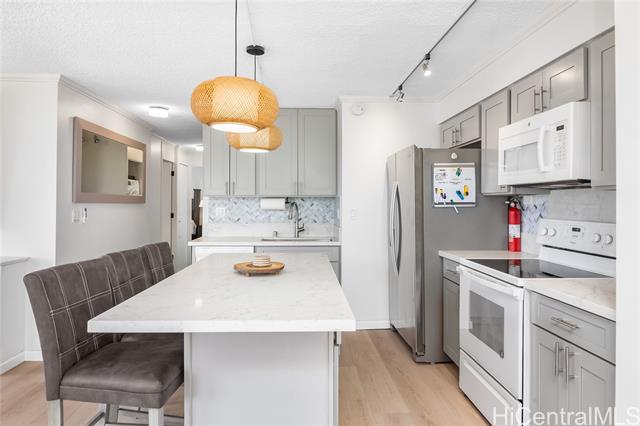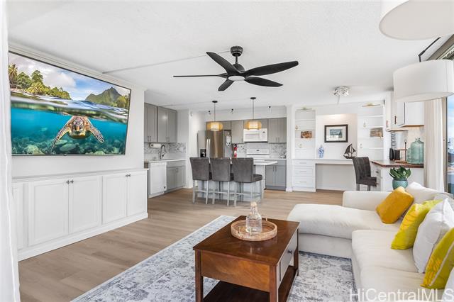 Enjoy island living in this beautifully updated 2-bedroom, 2-bath condo with 1 covered parking, perfectly positioned along the Ala Wai. This bright and airy unit features an open-concept layout with a modern kitchen, sleek cabinetry, and a spacious island ideal for entertaining or everyday living. The living area flows seamlessly onto a large lanai where you can take in stunning views of the Ala Wai canal and Diamond Head. Both bedrooms are well-sized, offering comfort and flexibility, while the updated bathrooms add a clean, contemporary touch. Stay cool year-round with split AC and enjoy the convenience of in-unit washer/dryer. The building has recently repaved the parking area, adding value and peace of mind. Located just minutes from Waikiki beaches, world-class dining, shopping, and golf, this home offers the perfect blend of convenience and lifestyle. Don't miss this opportunity to own a move-in-ready unit in one of Honolulu's most desirable locations.