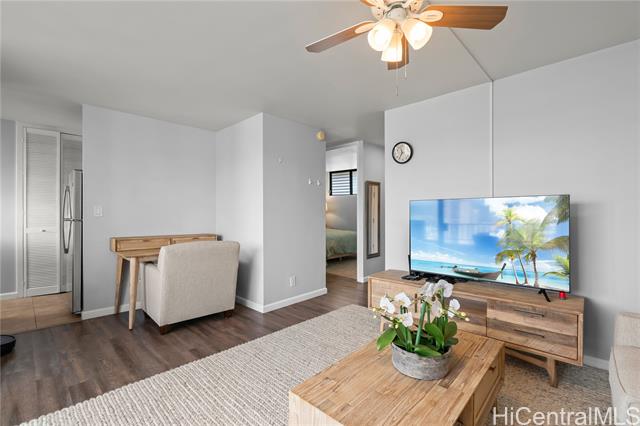 "2121 Ala Wai" is a condominium located along the Ala Wai Canal in Waikiki. All rooms face the mountains, allowing for a pleasant trade wind breeze and a comfortable living environment. From the spacious balcony, you can enjoy views of the Ala Wai Canal, the Ala Wai Golf Course, and the lush, green Konahuanui Mountain Range. The interior has been renovated to feature a modern gray and white color scheme, and the units come equipped with in-unit washers and dryers. One parking space is included, making it ideal for long-term stays and as a residence. The monthly maintenance fee includes electricity. Additionally, residents can enjoy the amenities such as a pool, lounge area, sauna, and a BBQ grill.