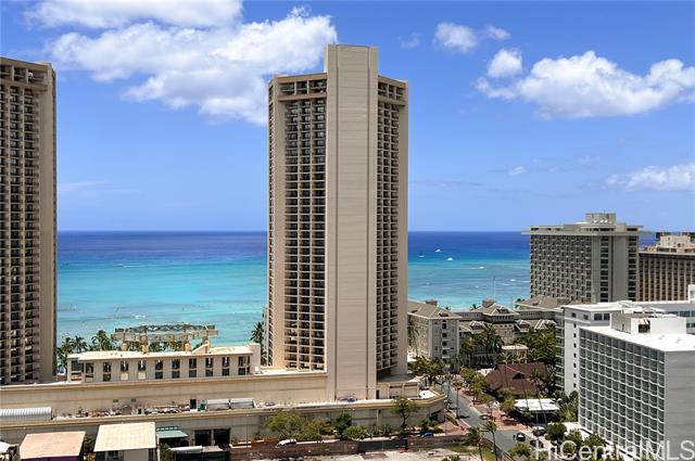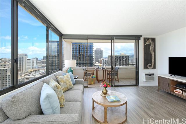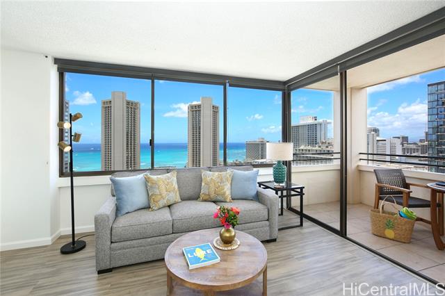 Location, Location, Location! Waikiki Skytower #2604 offers stunning 180-degree ocean, city, sunset, and Friday night fireworks views, plus TWO tandem covered secured parking stalls – a rare find in Waikiki. This fully furnished 1BD/1BA unit is move-in ready and currently operated as a 30-day minimum rental, making it ideal as an investment property or vacation home. Features include a spacious living area, remodeled kitchen and bathroom, and upgraded luxury vinyl plank flooring throughout. Relax on the large lanai and enjoy the island breeze. Just 4 blocks to Waikiki Beach and within walking distance to International Market Place, Kapiolani Park, tennis courts, surf spots, shopping, and dining. Building amenities include pool, BBQ area, sauna, recreation area, surf and bike lockers, guest parking, and pet-friendly policies (verify). Enjoy the best of Waikiki living with flexibility, convenience, and income potential. Seller will pay full amount of 2026 assessment ($472.50/month) before closing.