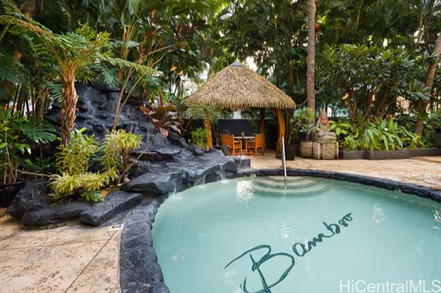 RESORT HOTEL ZONED condo approved for daily rentals. Rarely available larger studio with two lanais/patios overlooking the beautiful Resort Amenities of Bamboo. Total immersion of what staying in a Waikiki Resort feels like. Enjoy, while only being a short walk to world famous Waikiki Beach and all the night life!