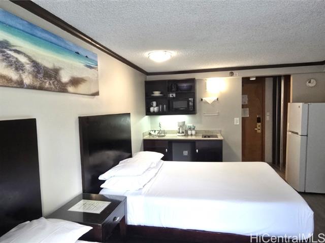 Legally approved short-term rental and hotel-zoned condo located right near the Waikiki Beach on Kuhio Ave. This unit is a preferred Two-Queen Beds Unit that also includes a Kitchenette with cooktop, refrigerator, microwave, Coffee maker, Pots and pans, and other kitchen amenities. The pool area has a tropical taste with a jacuzzi and bar/restaurant right beside the pool. Enjoy the income-generating unit for investment purposes.