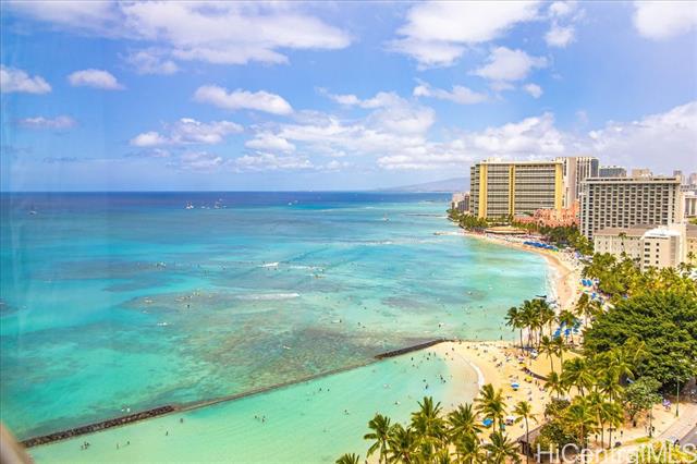 Location! Location! Location! Stunning views from the living room, lanai & bedroom! Luxury living in this updated large one bedroom/one bathroom Leasehold ownership opportunity. Own this Leasehold at a fraction of the Fee Simple and no expensive mortgage for these million dollar views. Perched on the 21st floor, this corner unit has wall to wall windows and glass sliders with incredible views of world famous Waikiki Beaches, ocean, surfing, mountains and city skyline. The inviting interior features a spacious open layout, separate bedroom w/ stunning beach views. Floor to ceiling large glass sliders open to the fabulous ocean view lanai. Whether you're searching for a second home, a primary residence, or a smart investment property, this LH purchase is resort-zoned and allows 30-day rentals, ideal for generating substantial income. Highlights Include: Luxury furnishings negotiable for an immediate turnkey rental, 1 covered, assigned parking stall, Pet-friendly (25 lbs), Secure building w/ 24/7 security & resident manager, New heated saltwater pool & whirlpool, gym, sauna & more! Don't miss this affordable opportunity to own a LH for sale in Foster Tower.