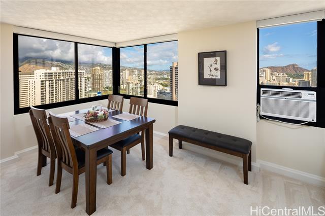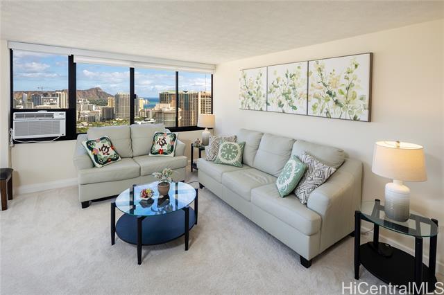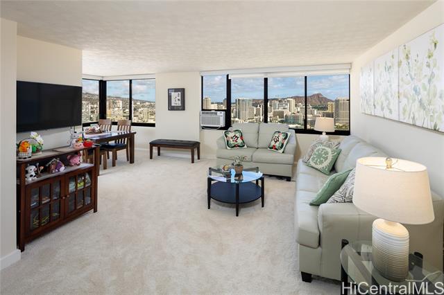 Welcome home to this ultra comfortable and spacious 2 bedroom, 2 bath unit with over 1,000 SQ FT of interior living space. Enjoy city, mountain, ocean, and Diamond Head views from throughout this unit. This unit comes fully furnished. All furnishings, cookware, and kitchen items were purchased within the last two years. See the pride of ownership in this well maintained sanctuary with soft wall to wall carpeting, cool AC, new window tint, and window shades. Conveniently located on the west side of Waikiki, out of the congestion and on the fringe of Ala Moana area. Close proximity to beaches, famous surf spots, Ala Wai Boat Harbor, world class shopping at Ala Moana Shopping Center, restaurants, eateries, and more. If you don't feel like going out then relax at home and enjoy some of the in-house amenities such as heated swimming pool, hot tub, putting green, rooftop deck with 360 degree views, BBQ areas, walking/jogging path, fitness center, and more. Don't miss this opportunity to own this turn key retreat in this quiet and mellow building with prompt elevators and only 4 units per floor.