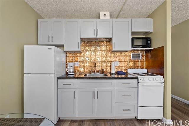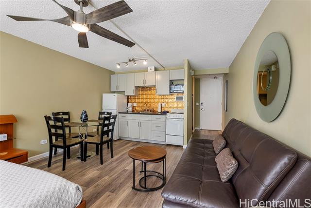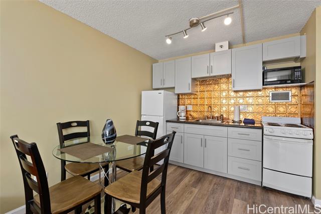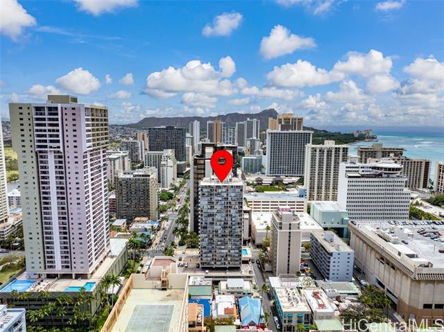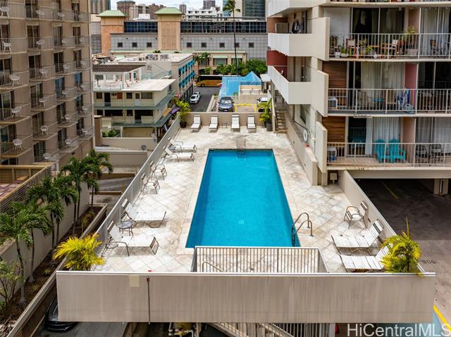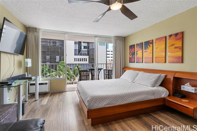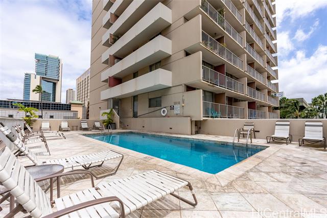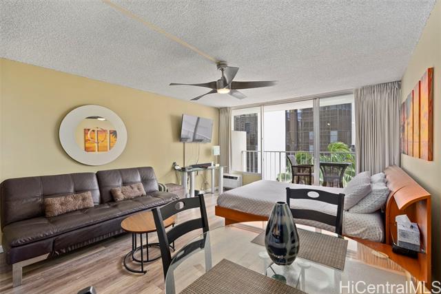 Amazing price for this legal short-term rental. A turn-key opportunity, ideally located right in the heart of Waikiki. This property is a gem for those looking to soak in the ambiance of a vacation stay at a world-class location, with renowned Waikiki Beach, diverse shopping experiences, and an array of amenities all within easy reach. This upgraded sleek and modern studio unit has both a cozy and versatile layout. The kitchen is a standout with its recent enhancements, featuring new cabinets and countertops along with the kitchen’s gold-patterned backsplash that injects a dose of elegance. Relax and take in the sights around you on the comfortably sized lanai. The unit comes with a secured, assigned parking stall, community laundry on each floor, and a building pool.