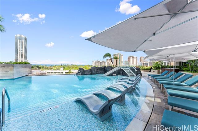 This high-floor Premier Residence showcases stunning ocean and Diamond Head views. Designed for comfort and elegance, the unit features a spacious living area, large bedroom, and oversized lanai ideal for entertaining or relaxing. Residents enjoy five-star amenities including two pools with water slide, spa, gym, sauna, whirlpool, valet, concierge, and resort-style services.