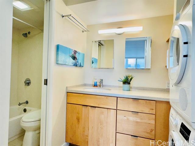 A must see! Chateau Waikiki is conveniently located at the entrance to Waikiki with resort-like amenities. This is a well-maintained, spacious 1-bedroom, 1-bathroom unit with canal/city/sunset view. 1-assigned parking stall inside a gated garage. NO POPCORN CEILING!! Tile flooring throughout the unit with soundproof underlayment. Custom maple cabinets and Quartz countertops in the open kitchen. Custom built Quartz desktop working station in bedroom. Custom-made automatic shades in living and bedroom. Washer and Dryer in unit. The 5th floor deck is beautifully landscaped with BBQ cabanas to entertain/relax with family/friends. Other amenities: heated saltwater pool, sauna, 2 fitness rooms, 2 recreation rooms, library. 4 modernized elevators. Easy access to Waikiki, Ala Moana shopping center, beaches, restaurants, entertainment and much more. Maintenance fee includes: AC, electricity, water, hot water, sewer and common area. A good size storage locker assigned to this unit on the same floor. There's bike and surfboard storage. 24 hour security. 100% hurricane insured. Unit in move-in ready condition. Furniture in the unit is included in the sale.