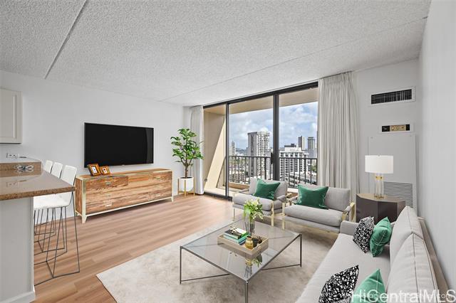 Wake up to morning light in this turnkey Chateau Waikiki home, perfectly situated in a quiet residential neighborhood at the entrance of Waikiki. This unit, on the cooler side of the building, offers abundant natural light and city views with privacy. Renovated in 2024, enjoy new flooring and appliances. Fantastic amenities include a pool, BBQ areas, recreation rooms, sauna, two gyms, and a library. Comes with a full-sized gated parking stall and storage unit on the same floor. Maintenance fees include central A/C, electricity and certain quarterly unit maintenance. Close to beaches, Magic Island, Ala Wai Yacht Club, Ala Moana Shopping Center and many restaurants. (Photos are virtually staged)