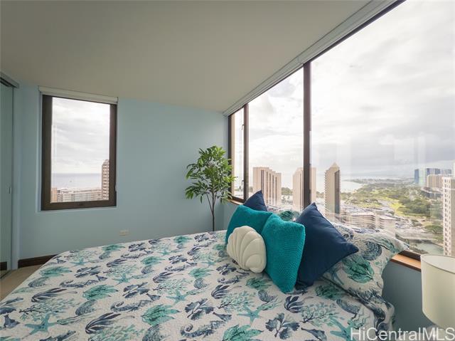 This upper-floor 2-bedroom, 1-bath residence at Chateau Wakiki offers wide-ranging views from the valley of the ocean, including Ala Moana Beach Park, the Ala Wai Canal, and the Hawaii Convention Center, with beautiful Waikiki sunsets enjoyed from the large open lanai. The modern interior features hardwood floors, electric blinds, pendant lighting, stainless steel appliances, and a bathroom finished with floor-to ceiling tile, along with the convenience of an in-unit washer and dryer. A valuable highlight is two well-located parking stalls-one on the ground level and one on the second floor-an uncommon and highly desirable feature in Waikiki. Chateau Waikiki is a well-maintained building on the sought-after west side of Waikiki, offering amenities such as a pool, gym, BBQ entertaining deck, recreation room, and library. the location allows easy access in and out of Waikiki, quick connections to Kalakaua Avenue and Ala Moana Boulevard, and is just a few blocks from Kahanamoku Beach Park, the Ala Wai Boat Harbor, nearby shops, restaurants, and entertainment. make an appointment and come see today! Disclaimer: one or more images have been virtually enhanced.