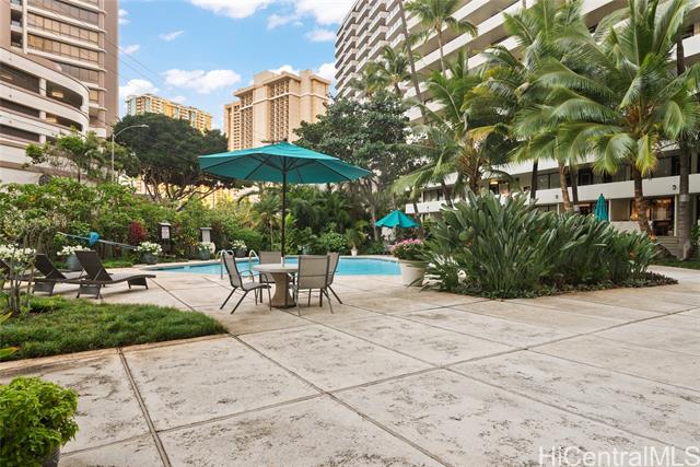 Discover island living in this 6th floor one bedroom leasehold unit in Kalia Building B. Positioned above the pool area and part of a well maintained living community, security patrol, secure gated fob access, tropical landscaping with garden paths, a heated saltwater pool, roof top laundry, and on site management. Conveniently located near the beach, Ala Moana, dining, shopping, and bus lines. Total monthly fees are $1,474.40 (Maintenance $689.70, Cable TV $53.61, Lease Rent $634.09, Property Tax $97.00). Pets allowed, please verify. Tennant occupied, currently month-month.
