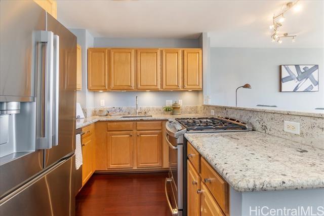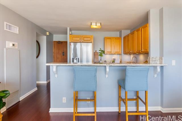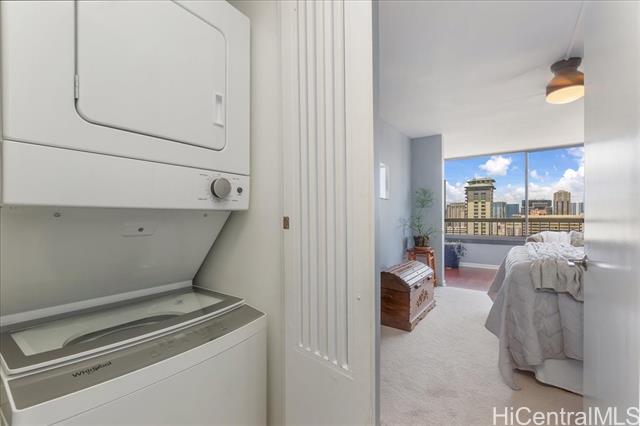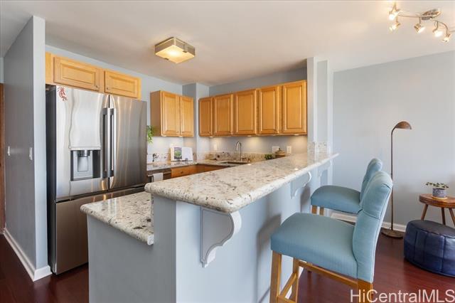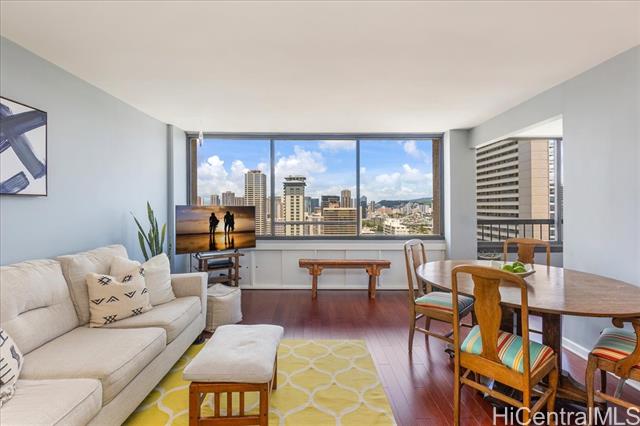 Discover a **RARE FIND** in the heart of Waikiki—this upgraded, spacious 2-bedroom, 2-bath condo comes with **2 PARKING STALLS**, a coveted feature in this vibrant area. Experience comfort and style with an efficient floor plan that boasts an open kitchen, walk-in closets, and your very own washer/dryer. For culinary enthusiasts, a rare gas range elevates your cooking experience. Quality enhancements include beautiful bamboo hardwood floors and upgraded kitchen and bath cabinets, counters, and appliances—it's truly move-in ready! Perched on a high floor, enjoy breathtaking views of the city skyline, the Ala Wai Canal, and majestic mountain ranges, with colorful rainbows gracing your daily life. Aloha Towers is a secure, pet-friendly building featuring resort-style amenities: a recreation deck with a heated pool, whirlpool spa, BBQ area and well-situated in a highly pedestrian-friendly area, just steps away from the beach, shops, eateries, and bus lines, making it the ideal Waikiki lifestyle. Plus, it's VA approved! The monthly maintenance fee of $1,962 covers all utilities, including gas, electric, cable, internet, sewer, water, and common area upkeep.