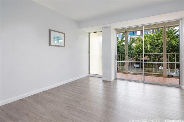 Wonderful location in Waikiki! Upgraded 2-bedroom, 2-bath, 1-parking residence, just moments from shopping, dining, parks, and the beach. The corner end unit offers an airy and inviting feel that opens to a spacious wraparound lanai that provides seamless indoor–outdoor living from every room. Some of the upgrades include vinyl flooring throughout and a thoughtfully updated kitchen with white all-wood shaker cabinetry, quartz countertops, stainless steel appliances, and an island with breakfast bar, perfect for casual dining or entertaining. Additional highlights include a full size stacked front-loading washer and dryer and a spa-inspired primary bath with a soaking tub. Furnishings and kitchenware are optional.