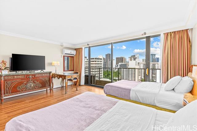 Don’t miss this exceptional investment opportunity featuring a legal daily short-term rental in a boutique condotel located in the heart of Waikiki. The bldg offers an elegant lobby, on-site manager, concierge service, valet parking and 24-hour security for added convenience & peace of mind. This high-floor unit showcases stunning ocean, mountain, Ala Wai Canal & city views from a private lanai. The unit is well-appointed with two twin beds and split air conditioning for comfort. Resort-style amenities include a swimming pool, sauna, exercise room, game room, outdoor BBQ area & community laundry. Ideally situated just moments from world-famous Waikiki Beach, parks, luxury shopping, dining, and everyday conveniences such as banks and grocery stores. Maintenance fees include electricity, internet, and cable TV. The parking garage offers both monthly & daily parking options for residents and guests. A must-see!