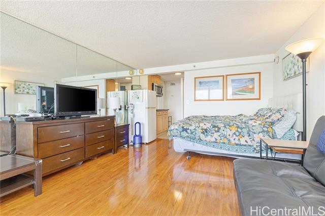 This fully furnished studio unit at Island Colony offers an efficient and rental-friendly 308 square feet of interior living space. The kitchen and bathroom feature tile flooring, while the living area is finished with durable laminate flooring, providing a practical and easy-to-maintain layout ideal for investment purposes. A standout feature of this unit is the exceptionally spacious 116-square-foot lanai, offering breathtaking Diamond Head views from the 35th floor. The expansive lanai provides an inviting space to relax, unwind, and enjoy the scenery high above Waikiki. Residents enjoy access to a variety of building amenities, including community washers and dryers, a fitness center, swimming pool, and BBQ area, enhancing both comfort and convenience. Ideally located in the heart of Waikiki, Island Colony offers excellent access to nearby restaurants, shopping, and entertainment, making this property a highly attractive option for both investors and owners seeking a prime Waikiki location.