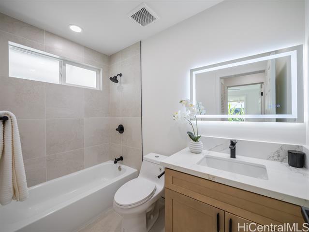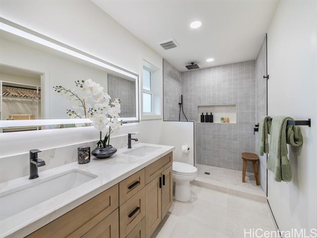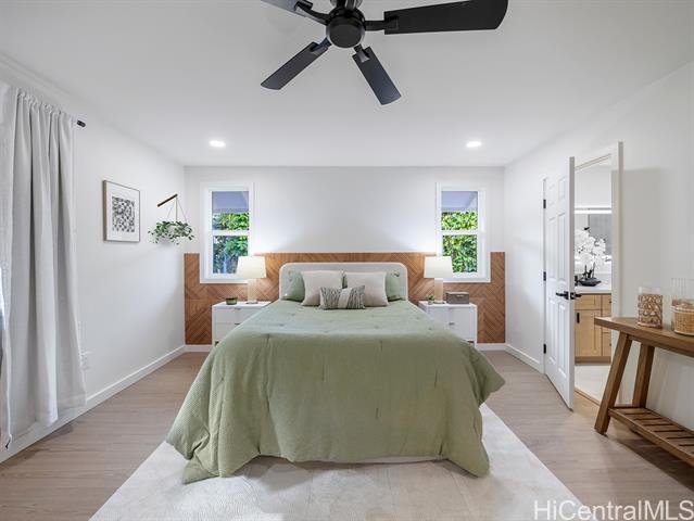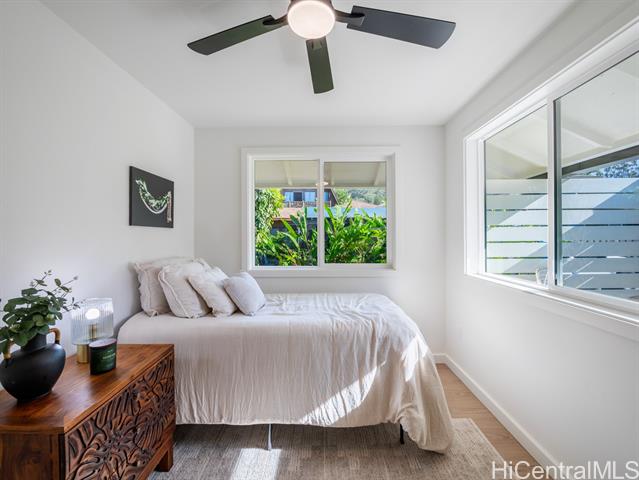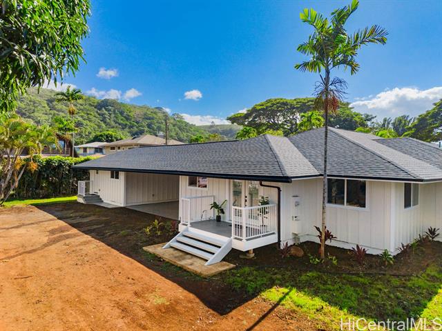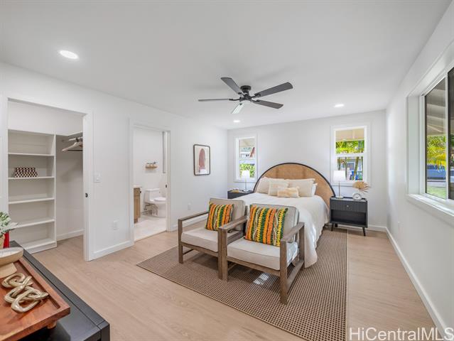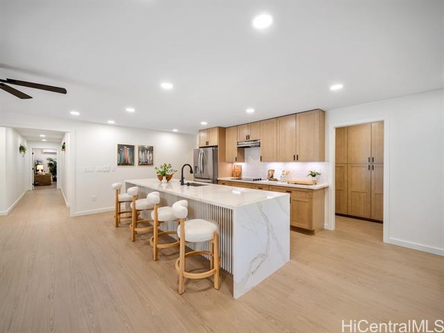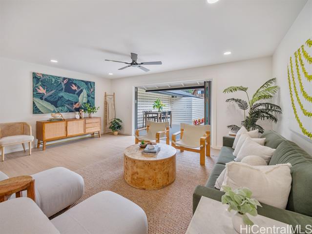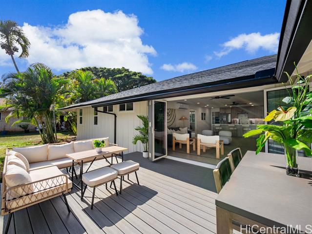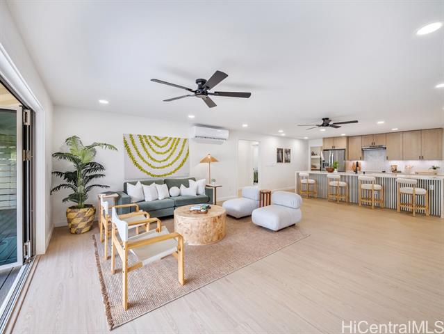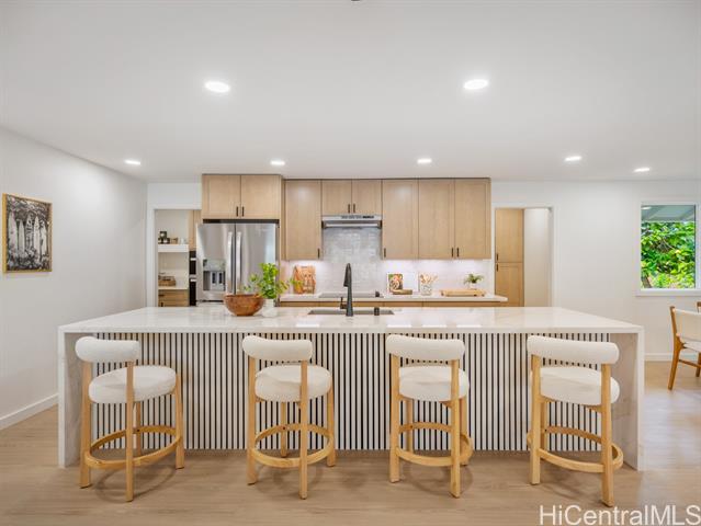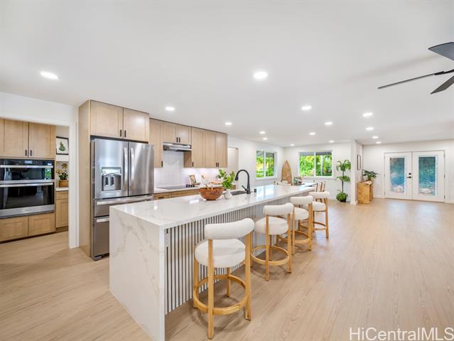 Thoughtfully redesigned for modern island living, this fully remodeled Haleiwa residence offers space, quality, and exceptional versatility on an oversized lot. Completed in 2025, the main residence features a spacious interior with wide-plank flooring, recessed lighting, split AC, and access to a generous lanai and yard for seamless indoor-outdoor living. The chef’s kitchen is a true centerpiece with quartz counters, a waterfall island, custom light-wood cabinetry & a stainless steel appliance suite. A standout feature is a rarely found butler’s pantry featuring dedicated prep space and double ovens. Two bedrooms, including the primary suite, feature en suite bathrooms. The primary retreat includes a walk-in closet and spa-style bath with double vanity and walk-in shower. The attached one-bedroom unit is complete with a full kitchen, bathroom, laundry, and a private lanai, making it perfectly suited for rental income, extended family, or guests. Set on an expansive lot with parking for 4+ vehicles, this home is designed for easy living, entertaining, and multi-generational flexibility. An invitation to experience where everyday living and long-term value come together.