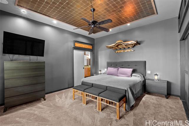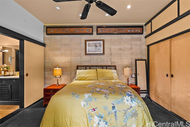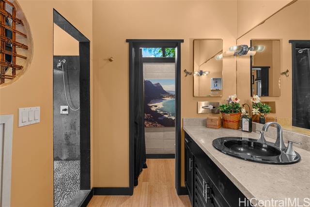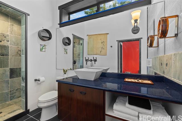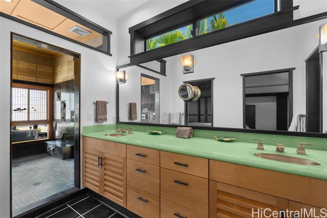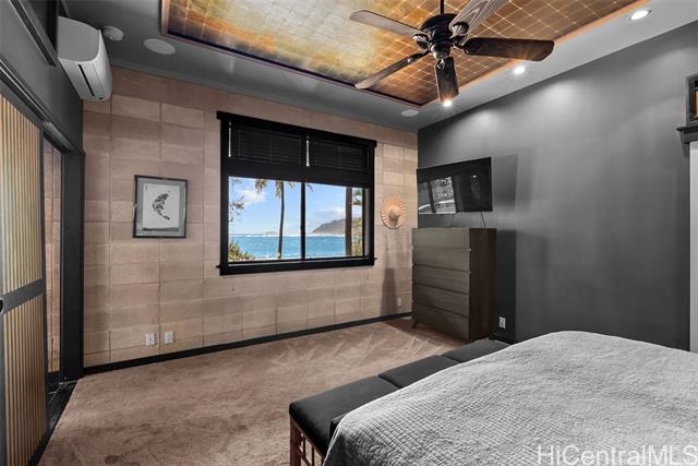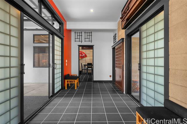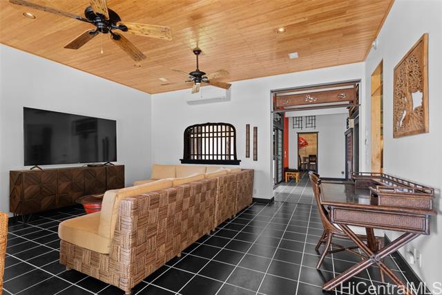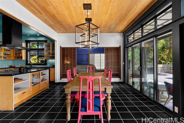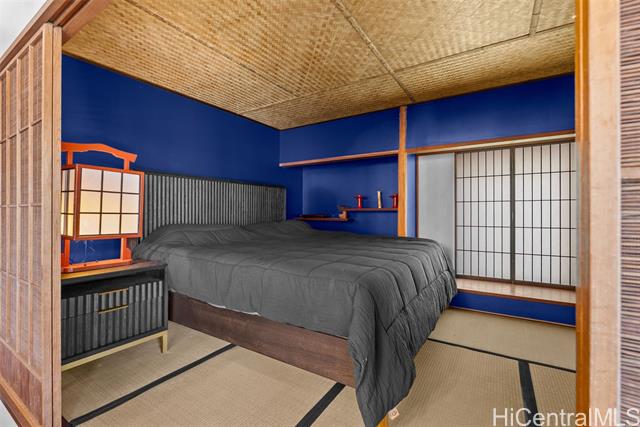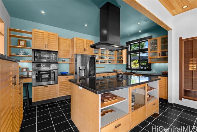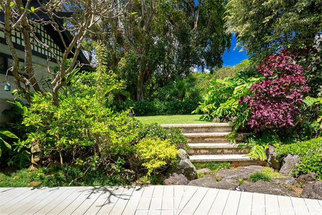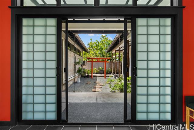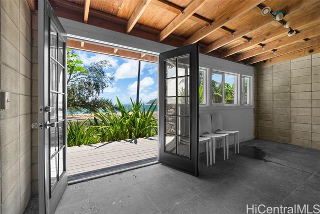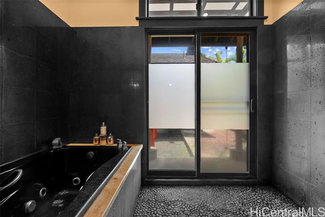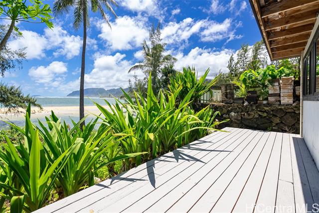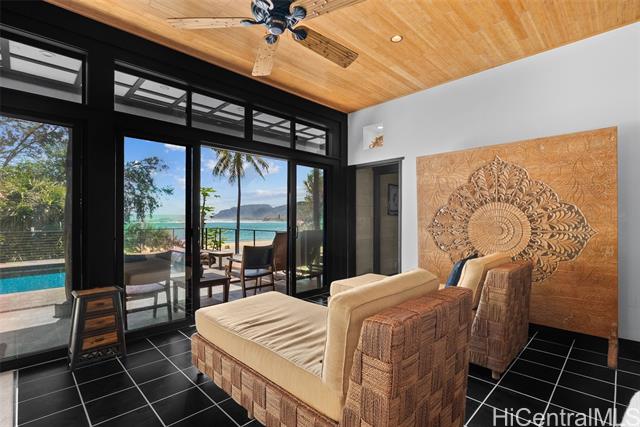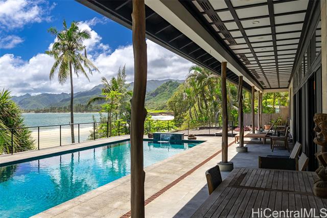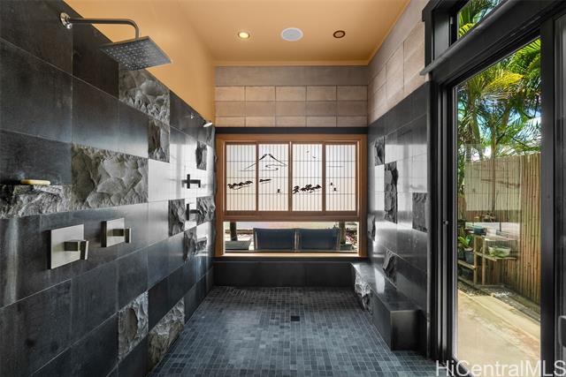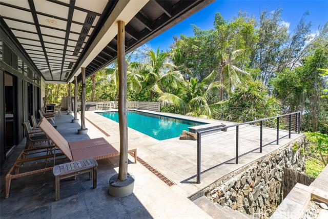Perched along a vibrant coastal landscape, this private 3 bed, 3 bath retreat captures panorama views of Laie Bay’s brilliant blue waters and beyond. The interior blends modern design with natural elements, featuring tiled floors, bright open walls, and warm bamboo ceilings that create an inviting yet refined aesthetic throughout. The kitchen is designed with both function and style in mind, complete with custom cabinetry, a copper sink, and an island cooktop, all positioned to take in the ocean views. Adjacent to the kitchen, a peaceful tea room adds versatility, easily serving as a fourth bedroom, guest space, or quiet retreat. The home’s bathrooms offer spa-like comforts, including a traditional furo soaking tub and steam shower for a relaxing, elevated experience. A gated entrance leads to an inviting arrival, where double doors open into a tranquil courtyard evoking a sense of calm from the moment you step inside. The outdoor spaces are framed by swaying coconut trees and the soft sounds of flowing water, creating a resort-like poolside setting designed for both lively gatherings and quiet moments of escape.