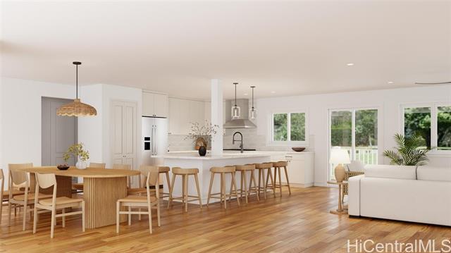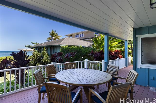 Welcome to 68-17 Laau Paina Place, a rare oceanfront property where the beach becomes an extension of your home. Step directly from your private beachfront lanai onto the sand. The main house is two stories with 4 beds, an office, a garage, and 4 baths, featuring an open floor plan and ocean views from nearly every room plus two covered ocean-facing lanais. The second home is an original 1940s cottage with 2 beds and 1 bath and an oceanfront patio. Waves break on the outer reef, leaving the beach swimmable year-round. Positioned in front of Devil’s Rock, renowned for big-wave surfing, tow-surfing, diving, and scuba. Launch jet skis from your front yard. Split A/C, separate meters, and septic. 1 of 4 beachfront homes within this 17-home neighborhood. Deeded beach access for Laau Paina Pl residents. Minutes from Haleiwa within easy reach of Honolulu and the airport. Mokuleia is known for empty beaches, scenic bike rides, polo fields, Dillingham Airfield, Dillingham Ranch, horseback riding, and hiking trails. Architectural renderings and photos 2-5 illustrate a potential kitchen-living area. Buyer to verify all information.