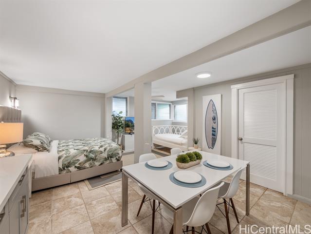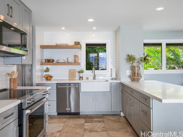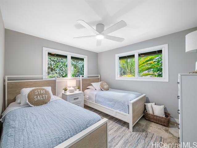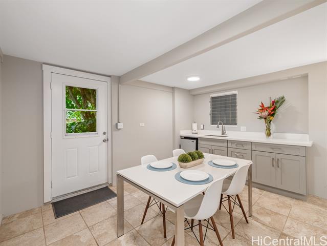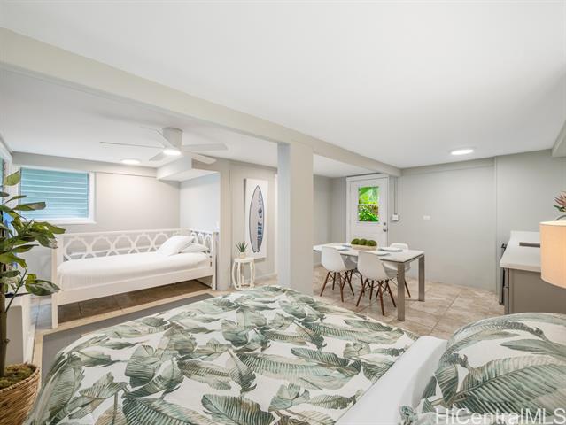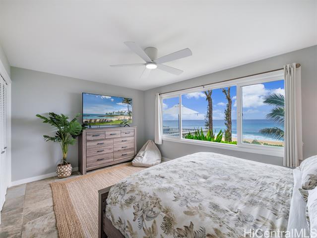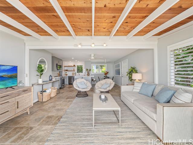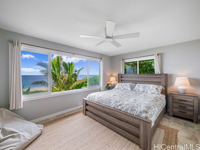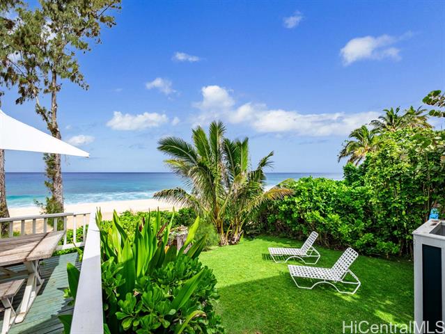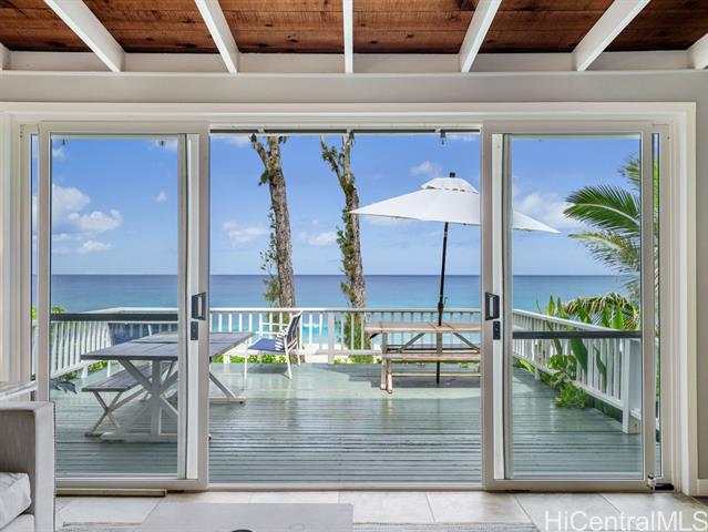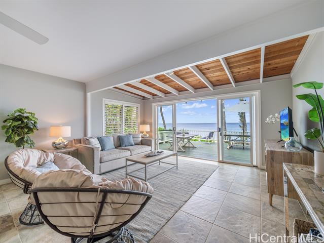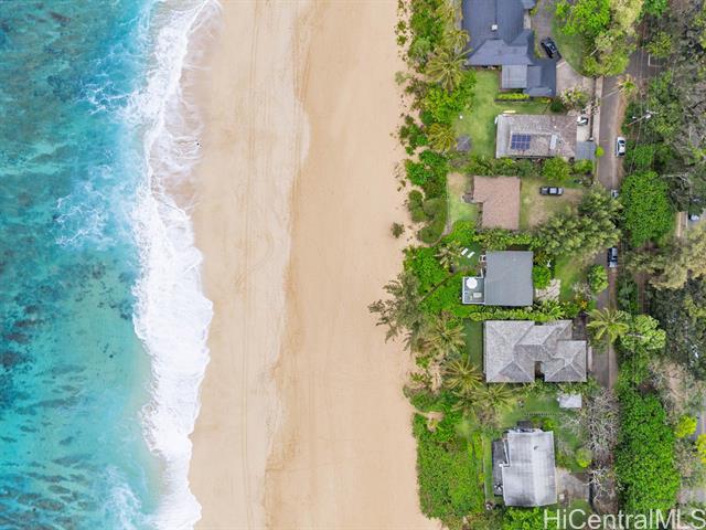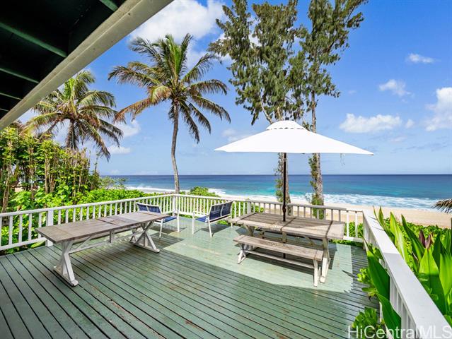 Welcome to your dream North Shore escape—perfectly positioned on the world-famous “7-Mile Miracle,” this exquisite beachfront residence sits along the iconic Log Cabins stretch, renowned for its pristine white sand, crystal-clear waters, and legendary surf. From the moment you arrive, you're greeted by sweeping ocean views, year-round sunsets, and the soothing rhythm of the waves—an ideal setting for both adventure and relaxation. The main level of the home offers two bedrooms and a full bathroom, featuring tasteful, modern finishes throughout. Downstairs, a renovated bonus studio with a separate entrance includes an additional full bathroom and kitchenette—perfect for guests or a private retreat. Inside, the sleek, contemporary kitchen flows seamlessly into the open-concept living space, dining area, and spacious lanai—an ideal setting for relaxing sunset viewing or lively gatherings with friends and family. Whether you're watching world-class surfers in the winter or spotting whales from your deck, this home offers a front-row seat to the best of the North Shore. Stylish, comfortable, and move-in ready, it’s more than just a beach house—it’s your private island sanctuary.