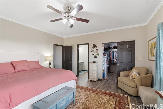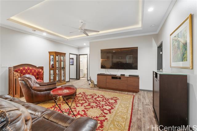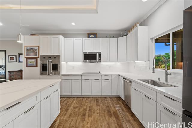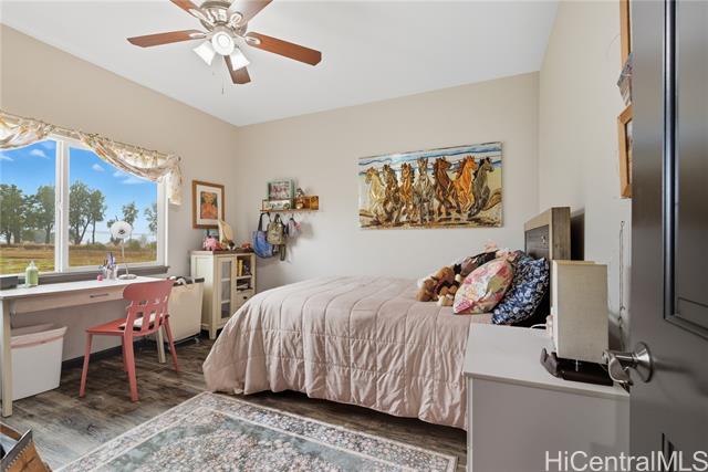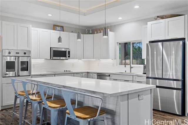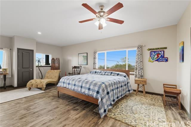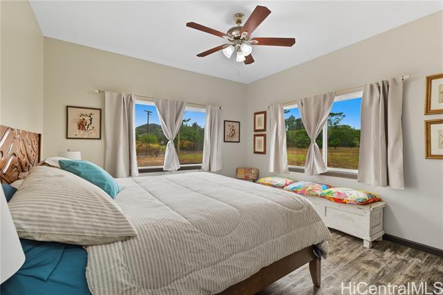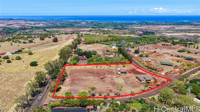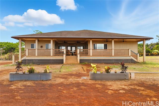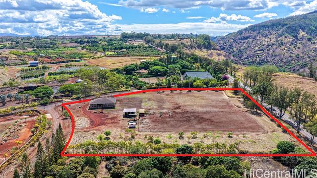 MODERN COUNTRY RETREAT – Perched on 5 acres of prime agricultural land in the highly desired private community of Poamoho Estates, this 4-bedroom + office, 3-bath home built in 2021 showcases sweeping ocean and mountain views. Designed for both island and country living, the open-concept layout features recessed ceilings, expansive windows, and seamless indoor-outdoor flow to two covered lanais—perfect for entertaining or sunset relaxation. Quality craftsmanship shines throughout, from the chef’s kitchen and airy living spaces to the two ensuite bedrooms, both with walk-in showers, walk-in closets, and double doors that open to a covered lanai. The primary suite adds an extra touch of luxury with dual sinks. Surrounded by rolling green hills and tropical landscaping, this newer home offers privacy, security, comfort, and convenience—just minutes from Haleiwa’s shops, surf breaks, and North Shore beaches. Poamoho Estates is one of Oahu’s last private communities of its kind, with large acreage properties, a peaceful country setting, and quick freeway access for easy commuting to town. Bring your horses, build your barn—there’s plenty of room to ride!