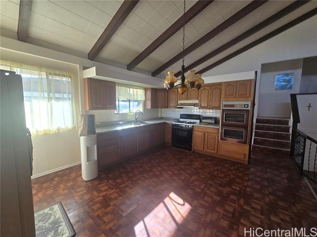 Unique Large home for multi-family use or rental. Located in highly desired Aiea. 1) Enter to a open vaulted ceiling main living room w/open kitchen. Three bedrooms, one full bathroom w/a large sized primary bedroom w/its own full size bathroom. 2) Attached 3 bedroom section w/full bathroom & wet bar. 3) Side attached one bedroom unit or large storage area w/covered sink area. 4) Features a HUGE garage and storage area, w/alot of potential that can be further improved. 5) Large open carport 5) Sizable enclosed back patio area & front upper deck area. 6) Extra storage areas throughout the home. 7) A lot of parking. 8) Views of Aloha Stadium. 9) Fruit trees in back: Pomelo (3), Avocado (1), Mango (1), Calamansi (2), Jack Fruit (1), Guanva Note: There are some unfinished areas due late husbands health issues. This home has been enjoyed as-is and has a lot of further upgrade potentials and value! Great home for someone who has building skills and/or contractor friends/family. Live in as-is or make improvements to take this home to an entire other level of enjoyment. (Square foot does not conform to tax records. Please do your own due diligence and inspections).