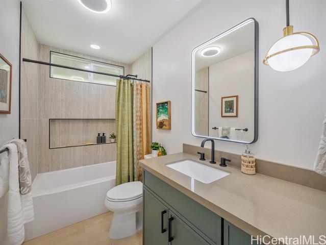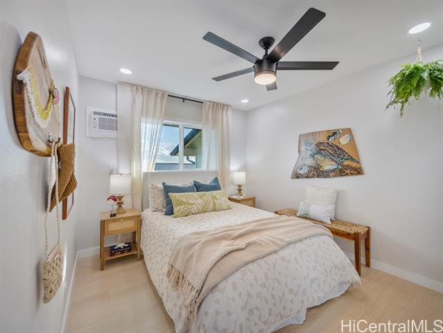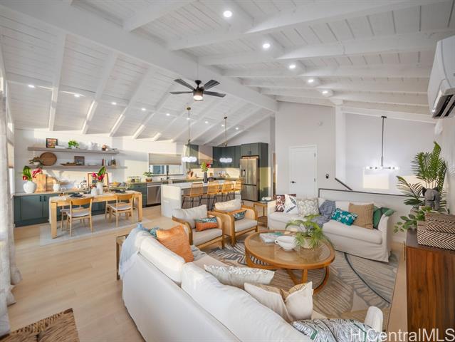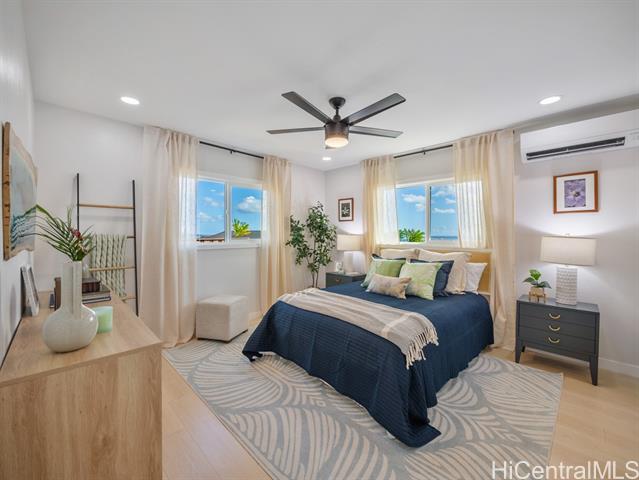 Welcome to this beautifully updated 4-bedroom, 2.5-bath home in desirable Newtown Estates. Featuring the exclusive Lanikai Maple flooring from the Mauka to Makai collection, this home offers modern comfort with island-inspired charm. Enjoy high ceilings, a spacious living area with split AC, and window units in all bedrooms. The generous kitchen is equipped with brand-new stainless steel appliances, and dual-pane windows provide energy efficiency throughout. A welcoming lanai invites seamless indoor-outdoor living, perfect for relaxing or entertaining. Take in stunning harbor views from multiple vantage points in the home. Move-in ready and thoughtfully upgraded, this is a must-see property in a prime location.