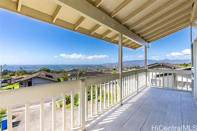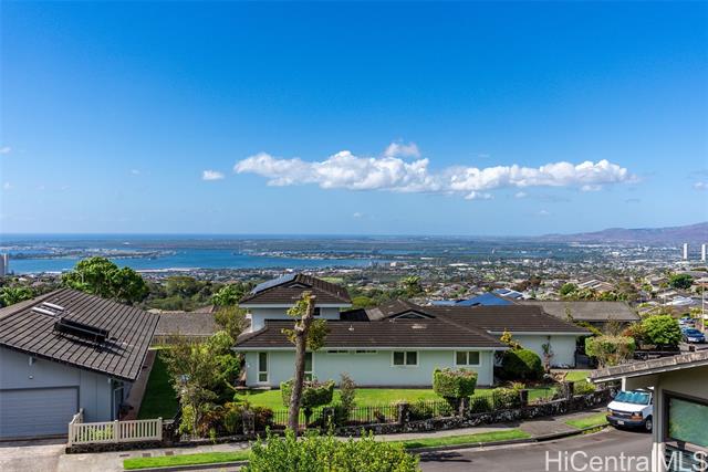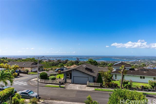 Located in the highly sought-after Newtown Estates neighborhood, this spacious 3-bedroom, 3-bathroom home sits on an expansive 8,108 sq. ft. rim lot, offering stunning panoramic ocean and city skyline views. With 2,202 sq ft of living space, this two-story home provides great potential ready for your personal touch. Features double front doors that open to the high vaulted ceilings in the living room and the sweeping views from the covered lanai. Downstairs, you'll find a versatile room with a wet bar along with a separate entry and a full bathroom. This level also includes a separate laundry room and an enclosed 2 car garage offering convenience and ample storage space. Newtown Estates comes with a membership to the community center, providing access to fantastic amenities such as a swimming pool, jacuzzi, tennis courts, basketball courts, pickleball courts, and a gym. Enjoy the convenience of being minutes away from Pearl Harbor, Pearlridge Mall, and the upcoming new stadium. This is your chance to update and renovate this ideally located home to your tastes and call it your own!