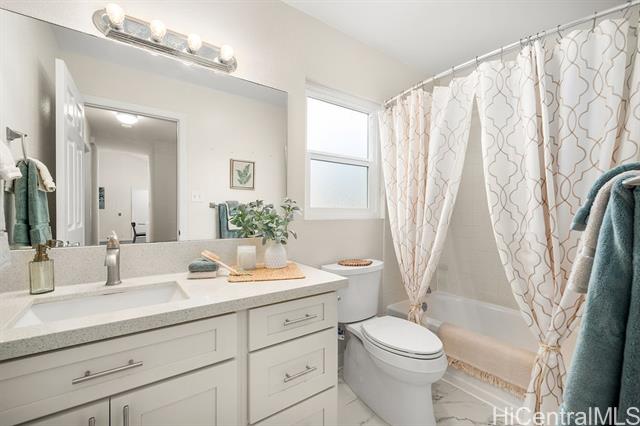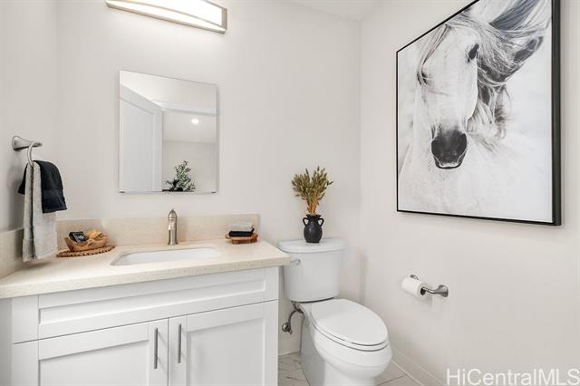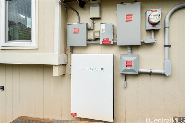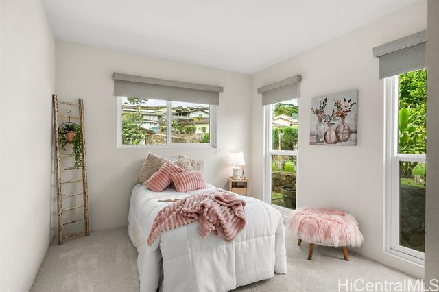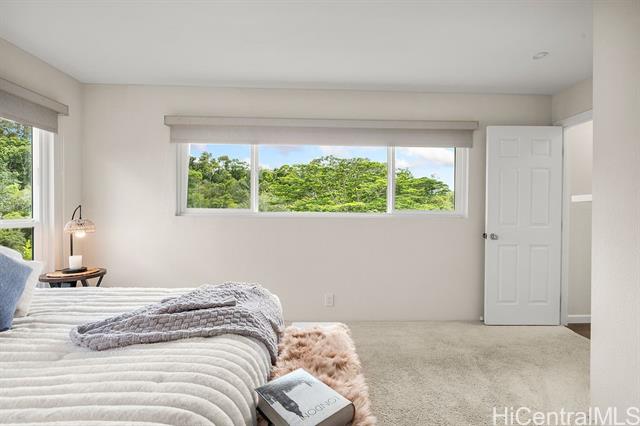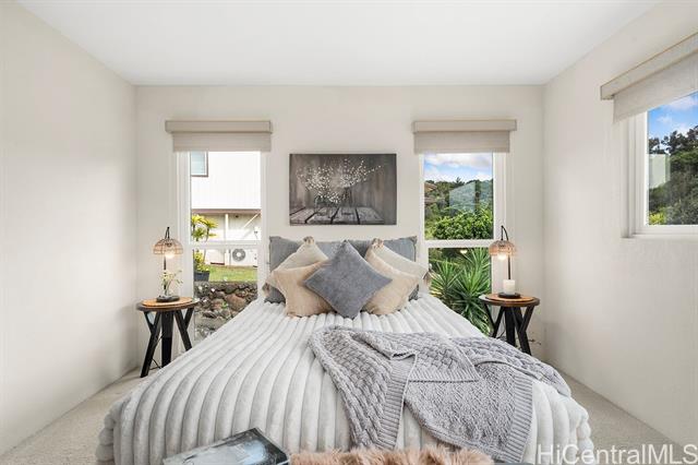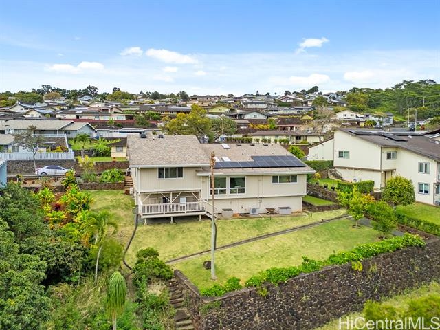 Peaceful and private retreat, lined with lush greenery, welcomes you home to Newtown Estates! This updated 3 bedroom, 2.5 bath home, on a large rim lot, features two spacious living areas with vaulted ceilings, skylights and large picture windows taking in plenty of natural light. Also included are split A/C in each room, an owned Photovoltaic System with Tesla battery and a bonus storage room with additional storage areas in the attic space as well as below the home. The primary living area, with 2 bedrooms, full bath, kitchen, living room and laundry, is located on the street/carport level for easy accessibility. Conveniently located near Pearlridge Center, hospitals, restaurants and military bases. Don't miss this opportunity to experience the serenity of island hillside living!