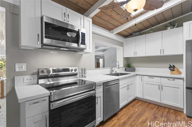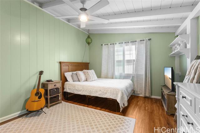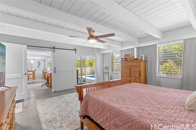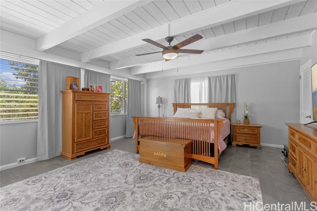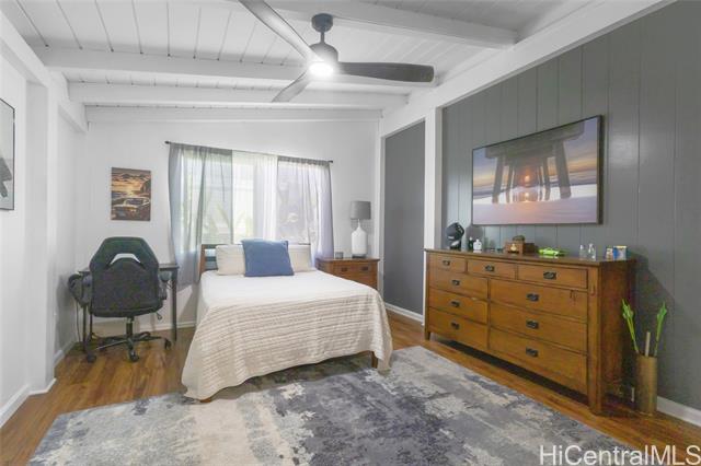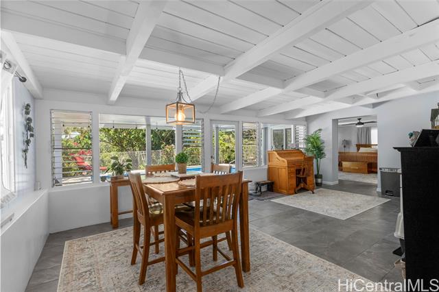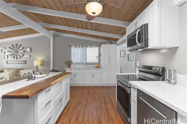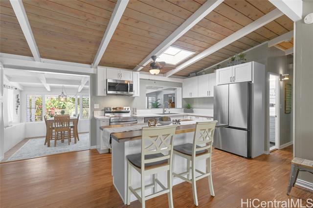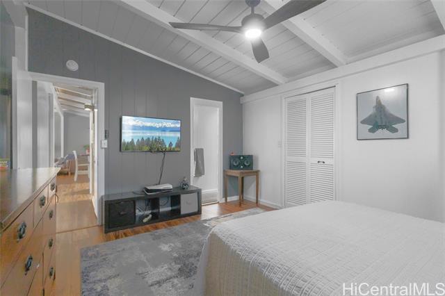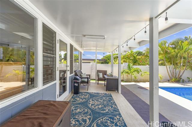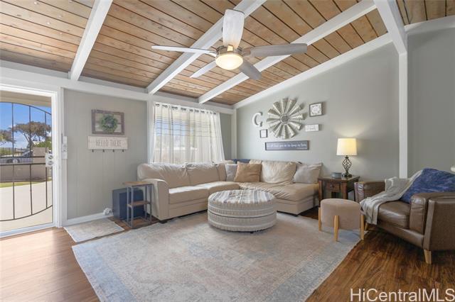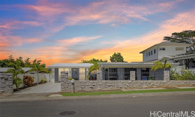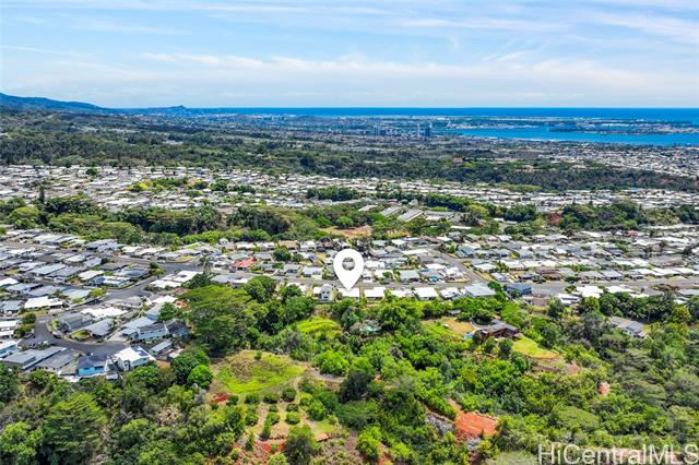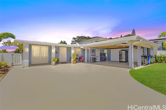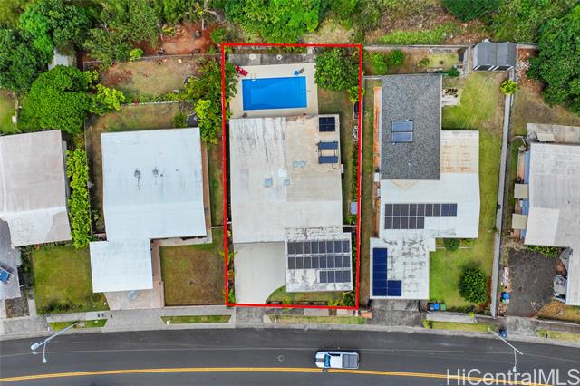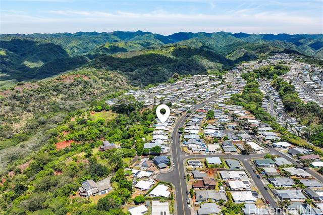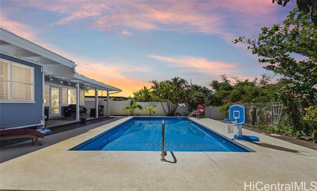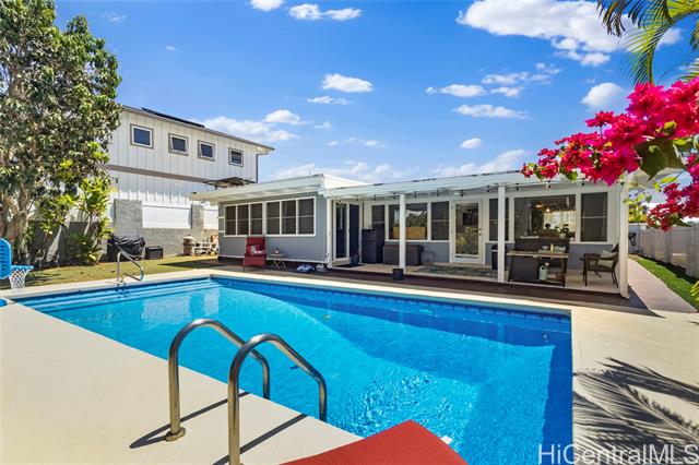 Open House 10/4/25 (2-6pm) & 10/5/25 (12-4pm). Experience true island living in peaceful Pacific Palisades—where mountain apples grow in your backyard, and weekends are spent poolside with unobstructed views of the leeward mountain range sunsets. Tucked away in a quiet rim lot setting, yet just minutes from shops, restaurants, Pearl Harbor/Hickam & Schofield. Enjoy a scenic waterfall hike just up the road, the charm of the neighborhood with a community center (hosting monthly events), shaved ice spot & other convenience shops. Step inside to a freshly remodeled single-level home with vaulted ceilings, newer windows, and a bright open layout, a supersized primary suite (with walk-in closet), 2 oversized bedrooms and a vibrant guest room. The updated kitchen shines with new cabinets, quartz counters, and modern appliances. Energy-efficient living comes with 20 owned PV panels + grandfathered NET METERING, a solar water heater, and a stand-alone solar pool pump—average bill for current owners is only $50/month. Parking is easy with a 2-car carport & an oversized driveway perfect for a boat! Move-in ready and waiting for your next chapter! Note: Bedroom count differs from tax records.
