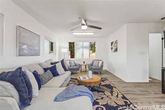 Welcome to this beautifully updated 3-bedroom, 2-bath home with a versatile recreation room in the heart of Pearl City. The bright and airy living room, filled with natural light, creates an inviting space for both everyday living and entertaining. Renovated kitchen with sleek cabinetry, quartz countertops, and stainless steel appliances opens into the main living areas. Both bathrooms have been tastefully remodeled, featuring updated vanities, modern fixtures, and clean finishes that bring a fresh, contemporary feel. Windows throughout are double-pane, and outside, a covered patio offers the perfect setting for gatherings or evenings at home. The two-car carport provides added convenience and storage. Centrally located near Pearl Highlands, Pearlridge Center, and freeway access, this home combines comfort, lifestyle, and accessibility