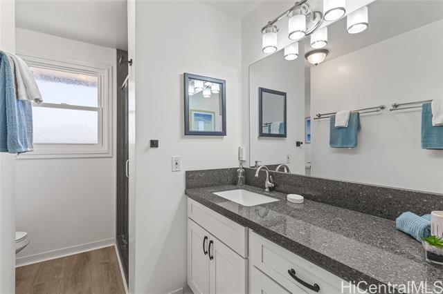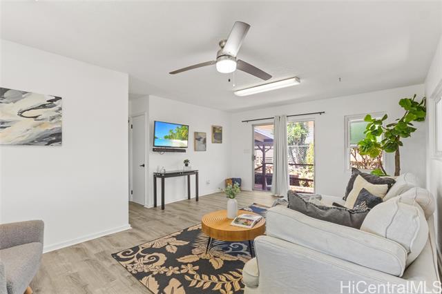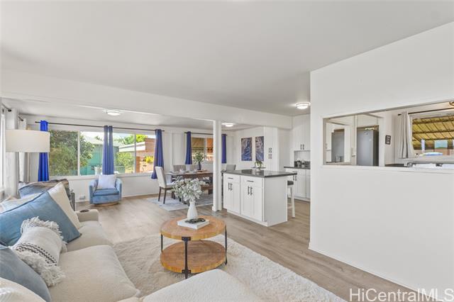 Discover this beautifully remodeled 3-bedroom, 2-bath home with a flexible recreation room, perfectly situated in the heart of Pearl City. The open-concept layout features a bright living area that flows seamlessly into the modern kitchen, complete with sleek cabinetry, quartz countertops, and stainless steel appliances. Both bathrooms have been stylishly updated with contemporary finishes and fixtures. Double-pane windows enhance comfort and efficiency throughout. Step outside to a covered patio, ideal for outdoor dining or entertaining. A two-car carport provides convenient parking and additional storage. Located just minutes from Pearl Highlands, Pearlridge Center, and freeway access, this home offers the perfect balance of modern living and everyday convenience.