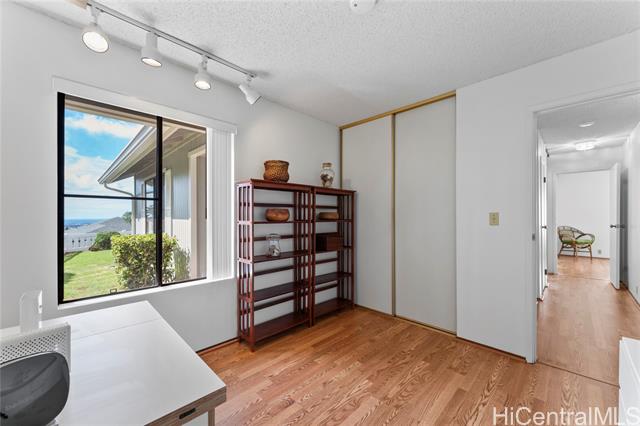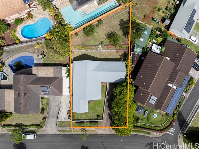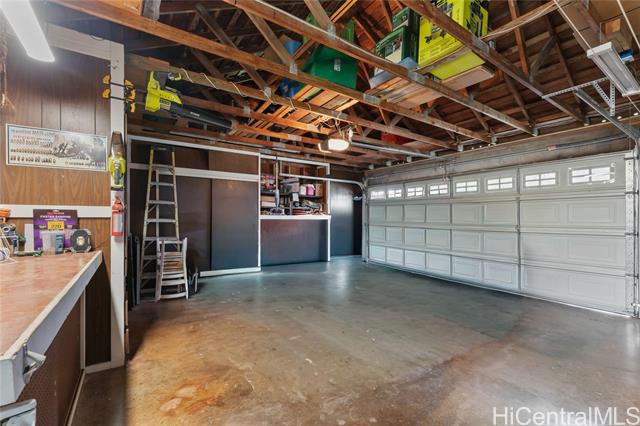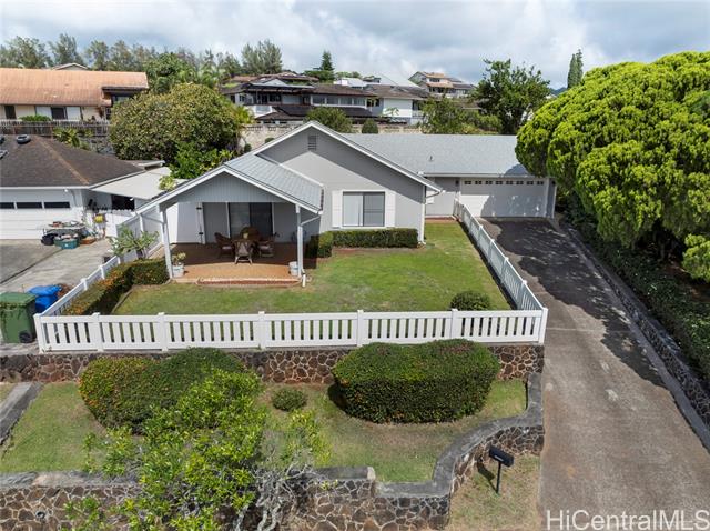Pearl Ridge Estates - tucked away on this quiet street - a single-level BEAUTIFULLY MAINTAINED single-family home with 4 bedrooms and 2 bathrooms. This huge lot, slightly over 10,000 sq ft, of fee simple land is perfect just as it is, with lava rock walls and custom landscaping. This home has a brand-new light composition Roof installed in September 2025. The blue/grey exterior with white trim was freshly painted in October 2025. Walk into the spacious home, and you are greeted with an entry and a freshly painted interior. An open floor plan of 1374 sq. ft. with gorgeous Vinyl Plank Floors, Slider windows, and a Recently RENOVATED Kitchen (2024) is perfect to move right in! The kitchen boasts stainless steel appliances and Golden Brown Cabinetry. No stairs to climb. Step out from this living area to a 224 sq ft covered lanai with futura stone that feels very private as you look out to ocean views. Easy entertaining from this stunning setting. Beautiful trade winds Flow through this home. 462 sq ft Large 2-car Garage with workshop/Storage. The backyard has moss rock walls and is completely fenced in back for privacy. Green lawn in front and back. NO ASSOCIATION AND NO FEES.