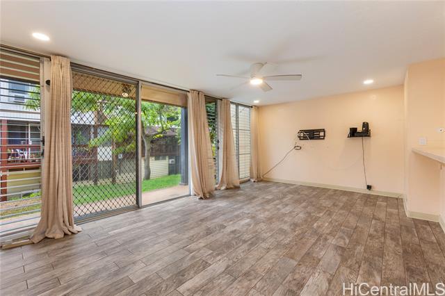 Welcome to Bougainville, nestled in the serene Koauka Loop area in Pearl City. This 3-bedroom, 2-bathroom townhome features stylish new tile plank flooring, a refreshed kitchen, and an extra enclosed area off the kitchen. The sliding door opens to a covered lanai, and the home includes 1 covered parking stall. Located across from Pali Momi Medical Center and minutes from Joint Base Pearl Harbor-Hickam, Camp Smith, Tripler, and freeway access. Enjoy Pearlridge Mall, dining, entertainment, year-round community events, and the community pool—perfect for weekend relaxation and socializing with neighbors. One or more photos have been enhanced.