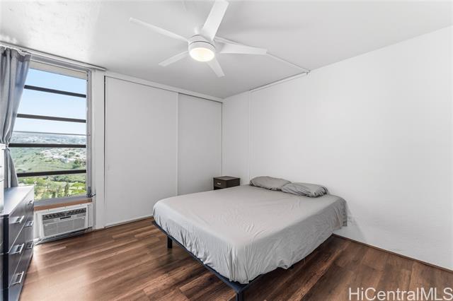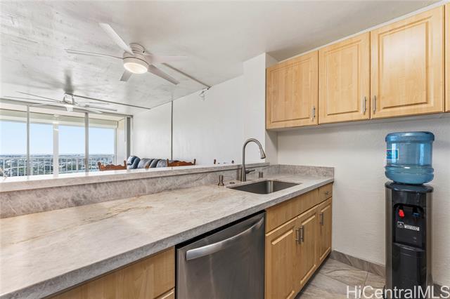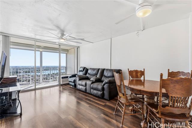 Stunning 31st-floor corner end unit, perfectly positioned to capture breathtaking sunrises over Pearl Harbor and Diamond Head. Recognized as the best location in the building, this home enjoys breezes and an ideal blend of comfort and convenience. Custom $12,000 motorized aluminum roll-down shutters are fully remote-controlled and nearly blackout—perfect for keeping the home cool, dark when needed. A 120V living room AC unit efficiently cools quickly, while solid concrete walls ensure excellent sound insulation. Brand-new kitchen countertops, new appliances and ample cabinetry create a modern, functional space. Additional upgrades include new faucets and shut-off valves, four ceiling fans, LED lighting, new outlets, a garbage disposal, and fresh interior paint. The new front-load washer and dryer, laminate and tile flooring (no carpet), and new blinds make this home truly move-in ready. Enjoy resort-style amenities—a large pool with whirlpool, tennis court, BBQ area, secured entrances, trash chutes, resident manager, and ample guest parking—all close to Pearlridge Center, Ka Makana Ali‘i, dining, parks, and easy freeway access in any direction.