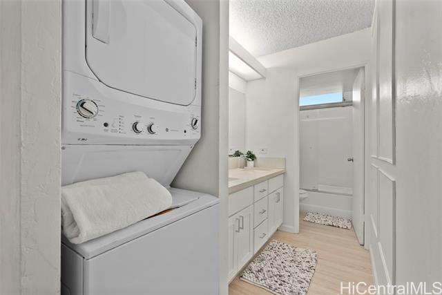 Move in ready, spacious low floor with treetop views. This remodeled 2-bdrm end unit at the Pearl One also has a washer and dryer in the unit for convenience. A secured building with guest parking, great management and amenities, including a pool, BBQ grills and a pickleball/basketball court. Conveniently located near Pearlridge Shopping Center, grocery stores, Pearl Harbor/Hickam AFB and schools. 3 photos have been virtually staged(enhanced).