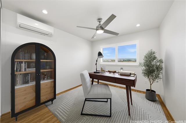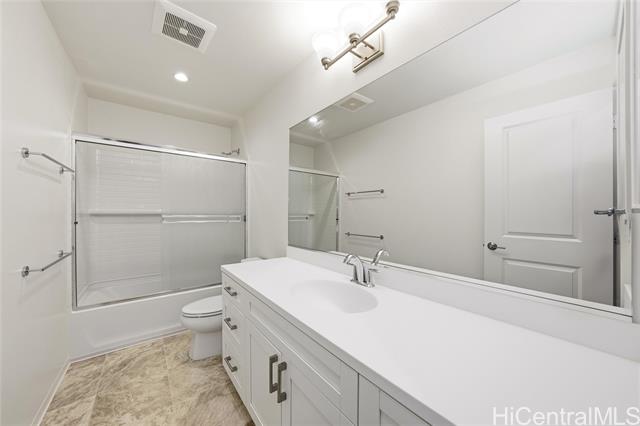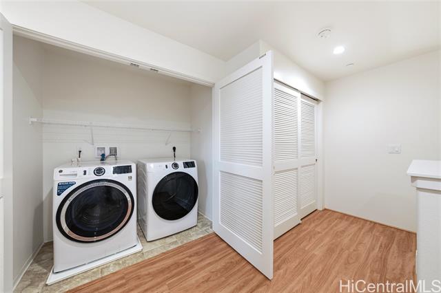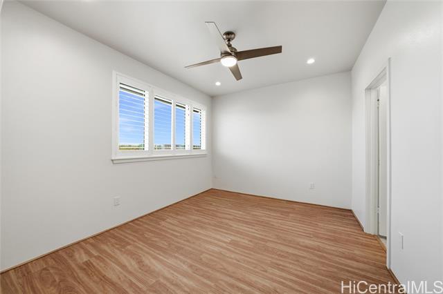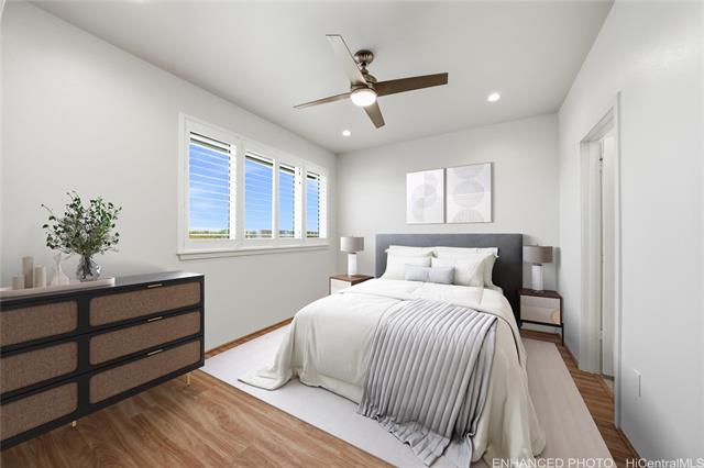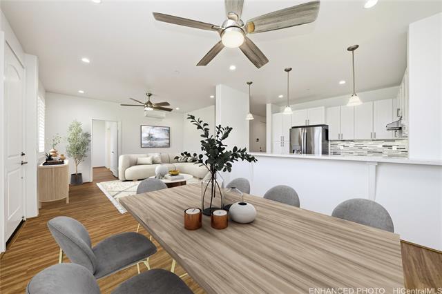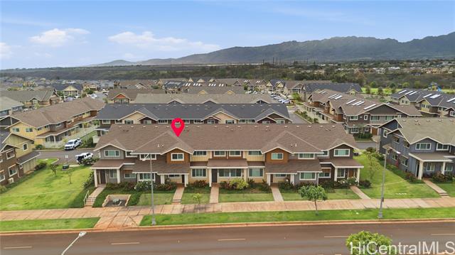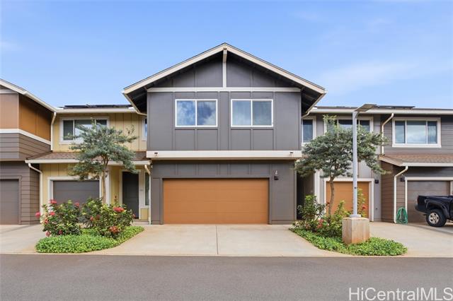 What if you could enjoy the space of a single-family home at a condo price in one of O‘ahu’s newest and most vibrant communities? Built in 2022, this largest model offers a full upgrade package with quartz kitchen countertops, luxury vinyl plank flooring, plantation shutters, recessed lighting with dimmers, split A/C, and ceiling fans in every room. The spacious floor plan provides four bedrooms, a dedicated office, and four parking spaces, including a two-car garage, two additional stalls, EV potential, and guest parking. A ground-level bedroom suite is ideal for your forever home, while a first-floor half bath adds convenience for guests. A smart home system lets you manage lighting, the garage, and security from your phone, paired with double-insulated walls for added quiet and comfort. HOA maintained landscaping and included cable, internet, water, and sewer, creating built-in savings. In the lively Koa Ridge community, you are moments from shared paths, a recreation center with classes and a pool, plus parks and pet-friendly areas that bring neighbors together, with Costco and freeway access close by. One or more photos are enhanced.