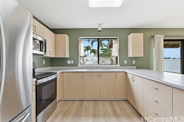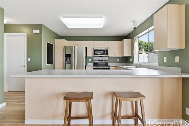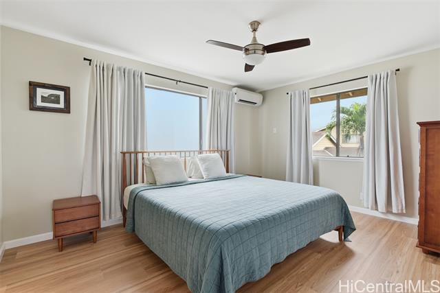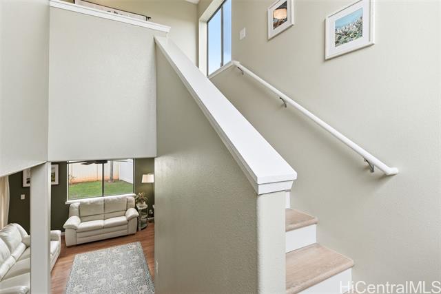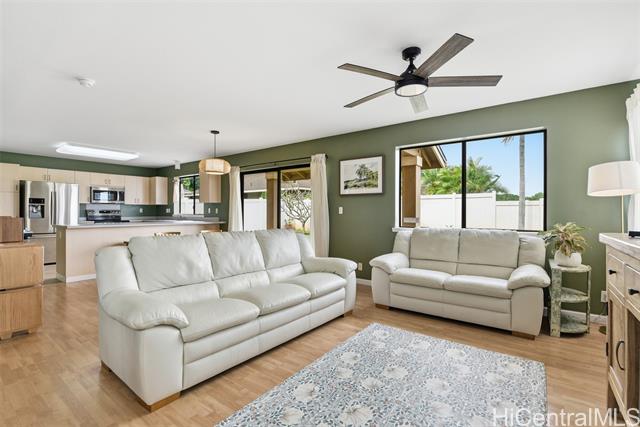 Tucked at the end of a quiet cul-de-sac in Royal Kunia, this 4-bedroom, 2.5-bath rim lot home offers privacy and open mountain views with no rear neighbors. Inside, the home has been well maintained and thoughtfully updated, creating a clean, move-in-ready space. The flexible four-bedroom layout provides room for guests, a home office, or growing households, and the 2.5-bath floor plan keeps daily life efficient and functional. The fully fenced backyard captures the breeze and offers space to relax or entertain. Located in the Royal Kunia community near parks, recreation areas, and everyday conveniences, this home combines comfort, privacy, and a practical layout in a desirable setting.