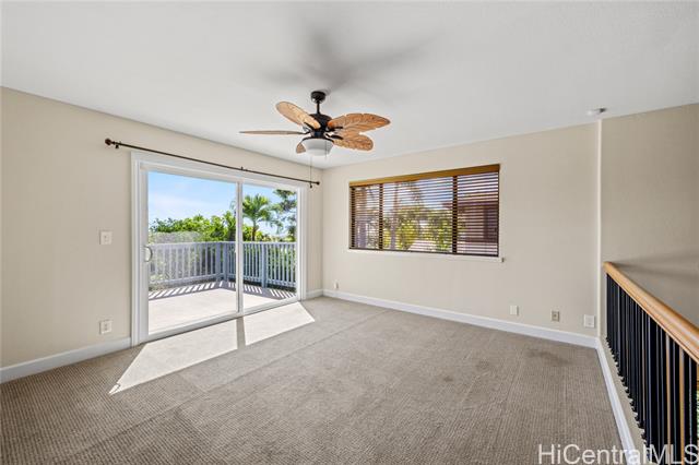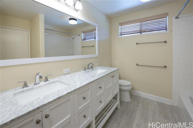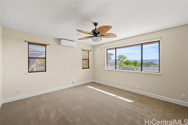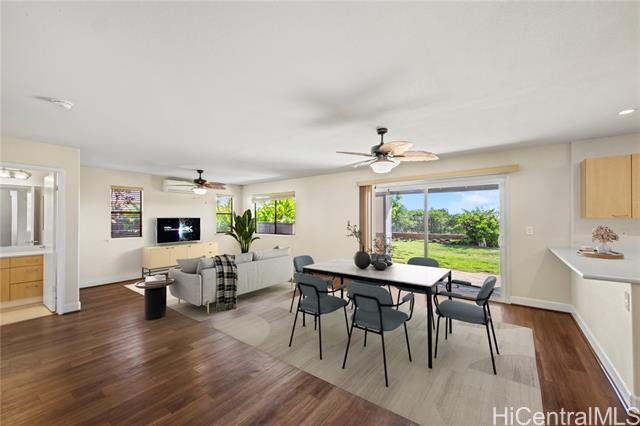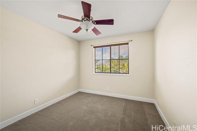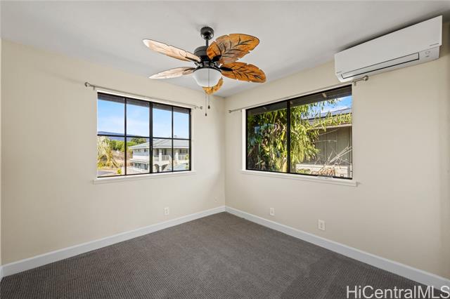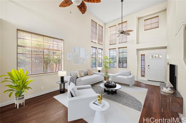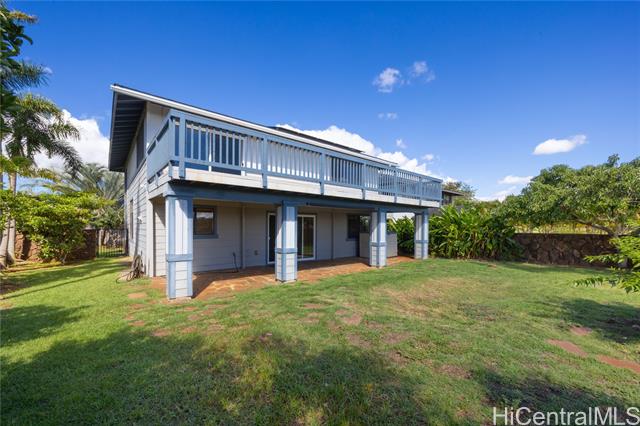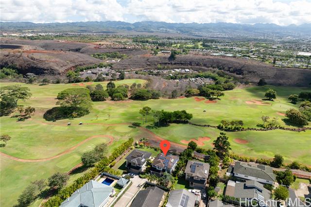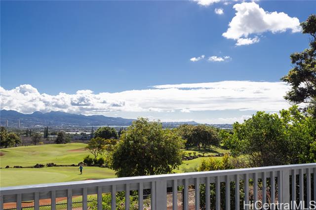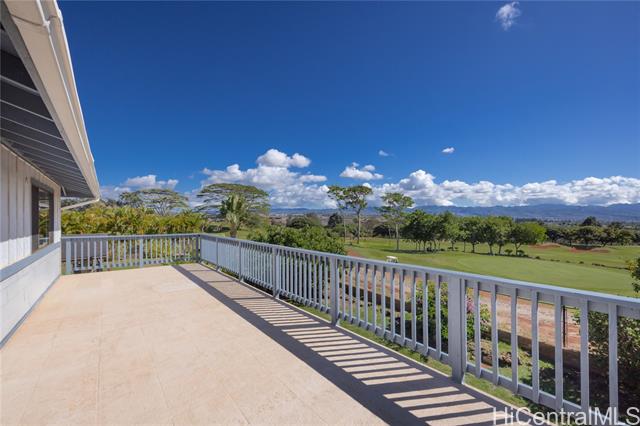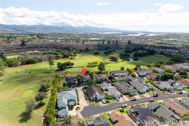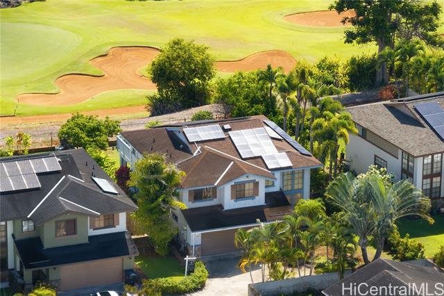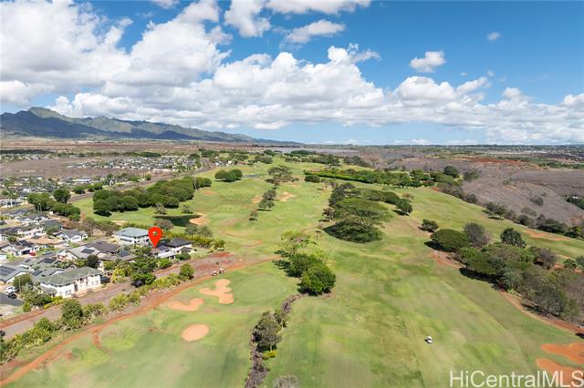 OPEN HOUSE THIS SUNDAY OCTOBER 19, 20025, 2pm-5pm. 2.25% VA Assumable ($665,000) Seller to retain VA Benefits. Situated on a quiet cul-de-sac overlooking the 14th green of Royal Kunia Golf Course, this 3-bed, 3-bath home offers spectacular, panoramic views from Diamond Head to Pearl Harbor. Enjoy the scenery from both upper and lower lanais. Inside, find comfort and efficiency with split AC's and a money-saving Solar Electric system. The property includes a 2-vehicle garage and a lush, edible garden featuring mature mango, avocado, tangerine, chico, and lemon trees. Excellent outdoor living space with both upper and lower lanais, you have the perfect vantage point for savoring your morning coffee or entertaining guests against a stunning backdrop. Gaze out at the incredible, sweeping views of the Honolulu skyline, from the iconic silhouette of Diamond Head to the historic waters of Pearl Harbor. Schedule your private showing today!