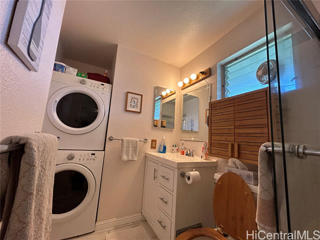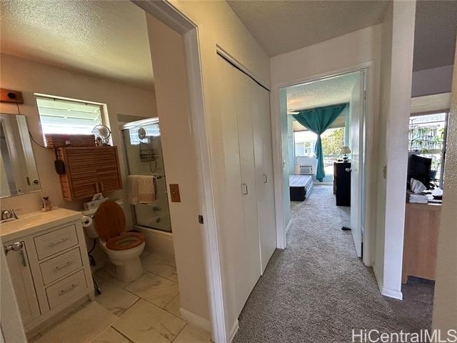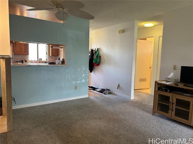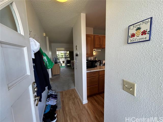 Well maintained move-in ready: Fee-simple, 2 bdrm/1ba 2nd floor end unit in quiet well maintained Ho’okumu at Waikele. The unit features plenty of natural light, west facing lanai for enjoyable sunset views. Bedrooms, living rm have ceiling fans. The primary/main bedroom has a window mounted A/C, and mirrored closet doors. New wall-to-wall carpet installed Oct. ‘24 in bdrms, hall, and living rm. The bathroom has a tub/shower combo w/sliding glass doors, recently installed porcelain tile floor and alcove with the in-unit washer/dryer. Kitchen has ceramic top stove w/self-cleaning oven, garbage disposal, and refrigerator. All cabinets are solid wood, a pass-through bar, and custom countertops. Kitchen and entryway has laminated wood flooring. Other features; EcoNet water heater less than 3 yrs old, RING doorbell system, electronic programmable front door lock, tinted windows with honeycomb style light filtering blinds, Hawaiian Telcom fiber- optic internet and cable access. 1 assigned parking stall, uncovered, guest parking avail with restrictions, nearby street parking. Complex offers car wash areas.