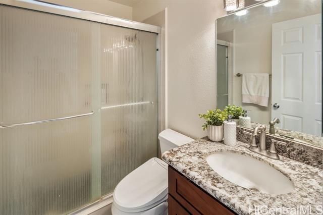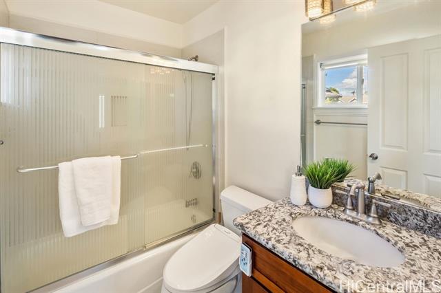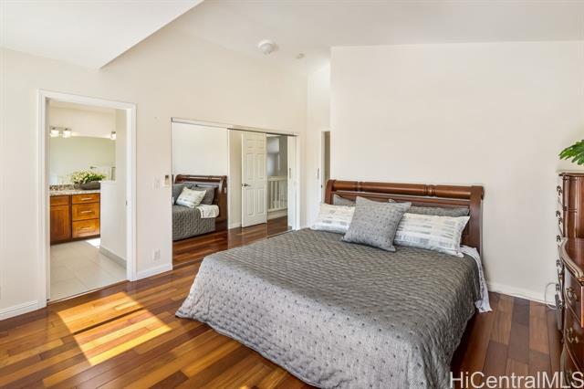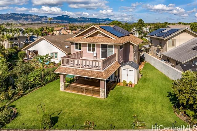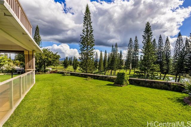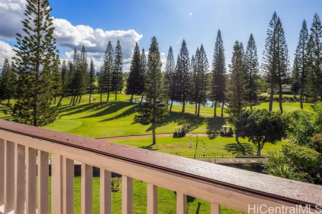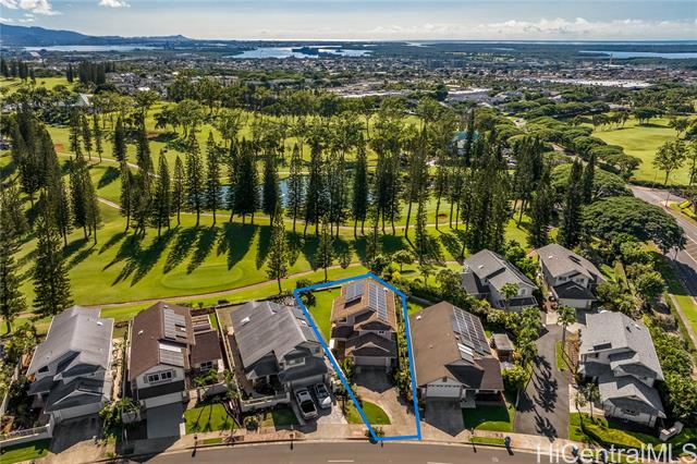 Beautifully updated Waikele single-family home views over the fairway of the Waikele Country Club (Hole #14) features vaulted ceilings and a light-filled living room that frames the golf course vista. Downstairs, a large covered lanai invites relaxing evenings and entertaining, while upstairs, the primary bedroom extends onto a large balcony/lanai, offering sweeping views, breeze and a private outdoor retreat. Recent interior upgrades include new hardwood flooring throughout and the exterior was freshly painted approximately three years ago. The generous lot offers a large backyard, perfect for outdoor activities and leisure, and the driveway accommodates more than three (3+) parking spaces, vaulted ceiling, soft water system, 28 PV Owned panels, a bedroom downstairs with full bath. Convenience reigns: this home is just minutes from direct freeway access, Waikele Premium Outlets and surrounding shopping/dining. Combine all this with the feel of an elevated, resort-style backyard view, and you have a home that blends comfort, style and practicality. Truly...one that balances outstanding upgrades, ample outdoor space, impressive parking and a premier fairway view setting.