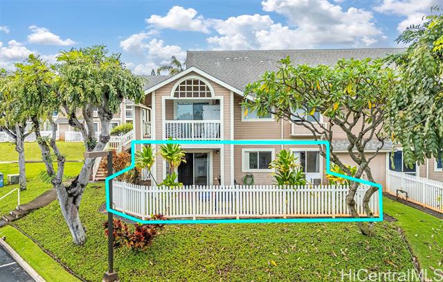 Rare, Larger 2-bedroom "Corner End unit" floor plan in Mahi Ko at Waikele. This single-level, ground-floor unit features an expansive private yard off the living room and a covered patio with peekaboo ocean views. Interior includes space for a small kitchen table and comes with all major appliances: washer/dryer, refrigerator, stove, microwave hood, and dishwasher. One assigned parking stall is located right outside the front door (possible stalls for rent from association), with multiple guest stalls nearby. Pet-friendly complex (buyer to verify), VA-approved, with an on-site resident manager. Convenient access to H-1, military bases, Waikele Premium Outlets, dining, golfing, and more. Sought-after neighborhood known for its breezes and central location. Turn-Key & Priced well! 3D digital walkthrough available online.